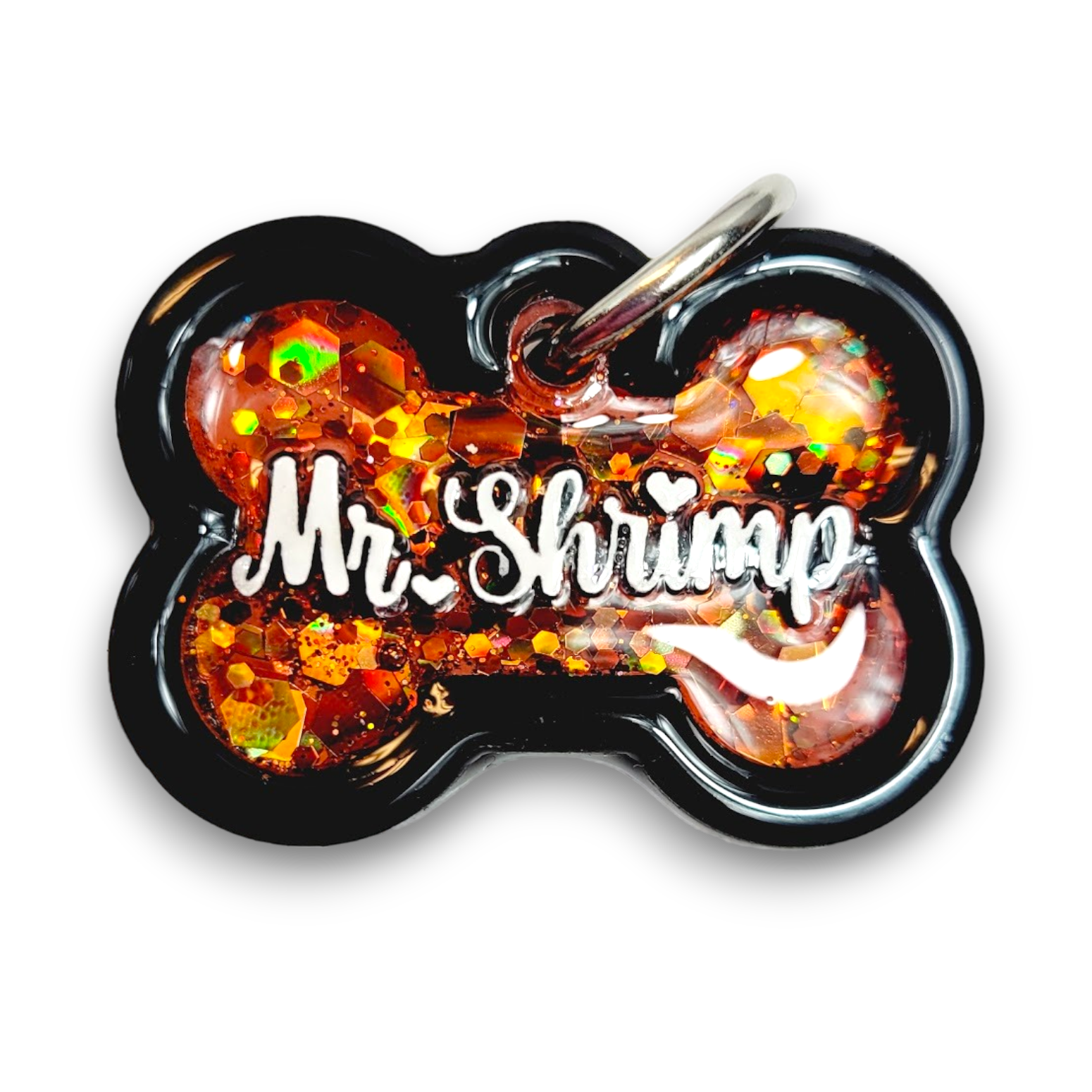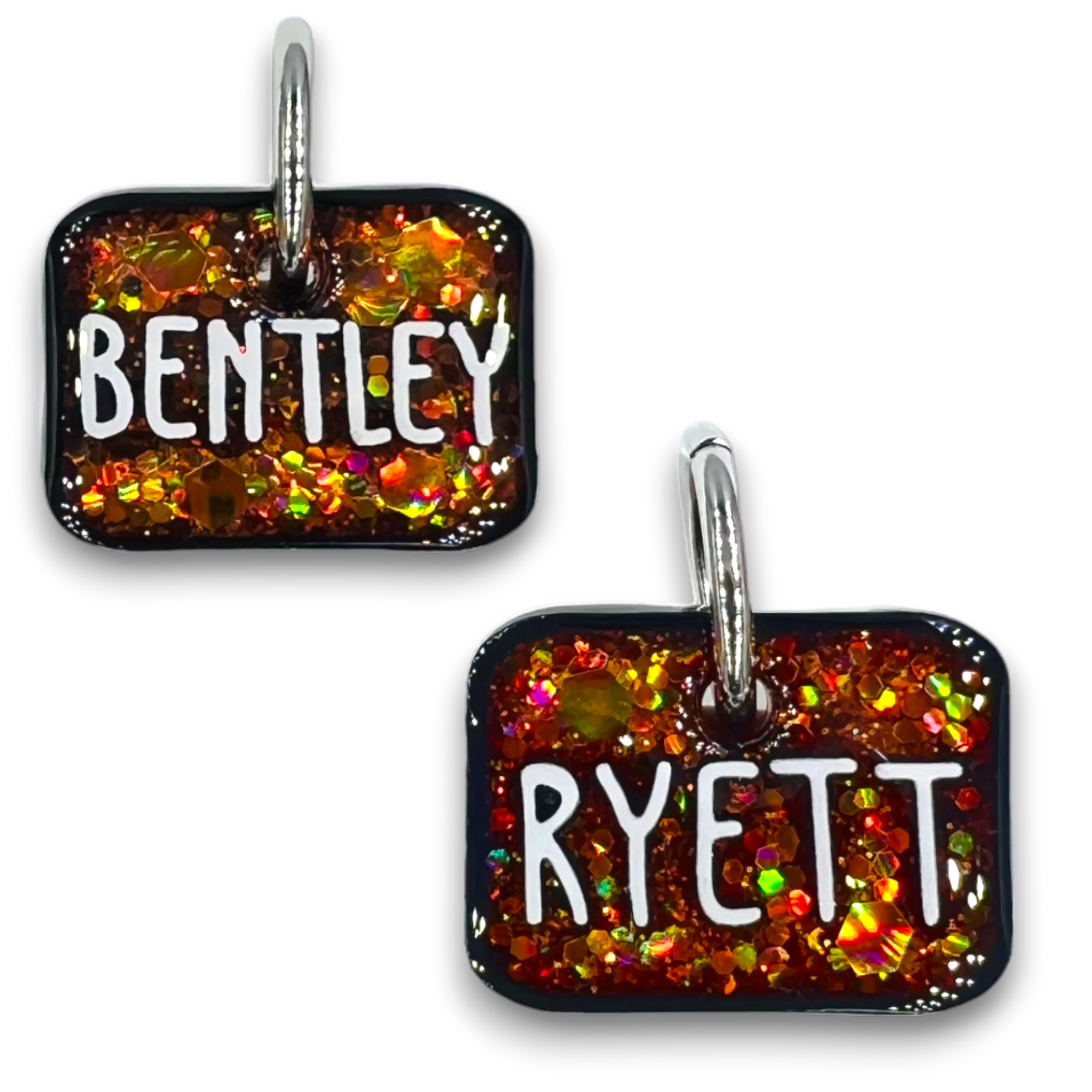 Our Poppin Select Series gives fur parents control over their customized tag. Choose from 16 colors and 12 sparkly fillings! Poppin Select Tags are approximately 1/4" thick- Please look at our tag size photo for full specs. Your pet's name will have a 3D effect and will POP! Each tag is hand painted and encased in UV Resin for durability and shine. Check out how they're made on our TikTok  & Instagram