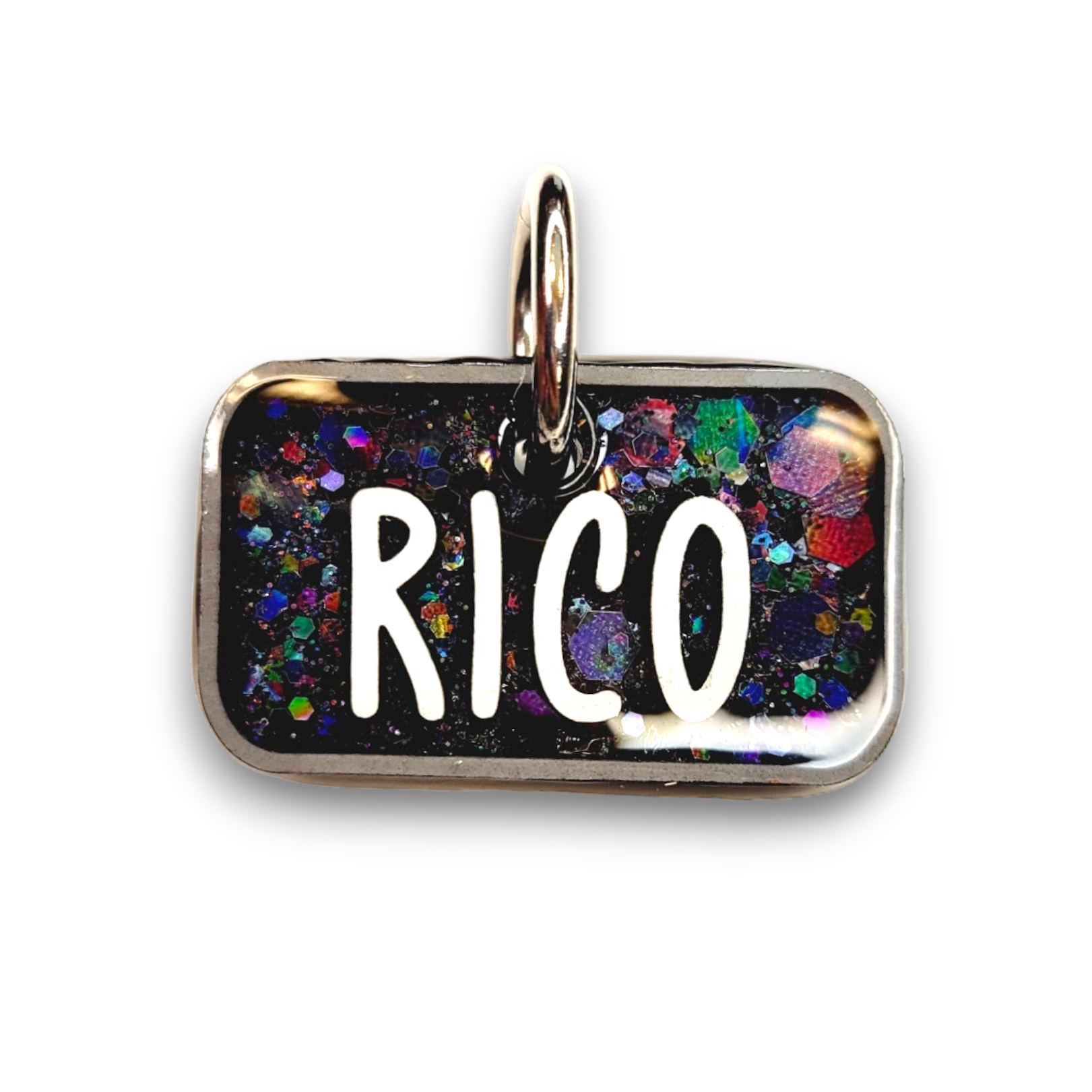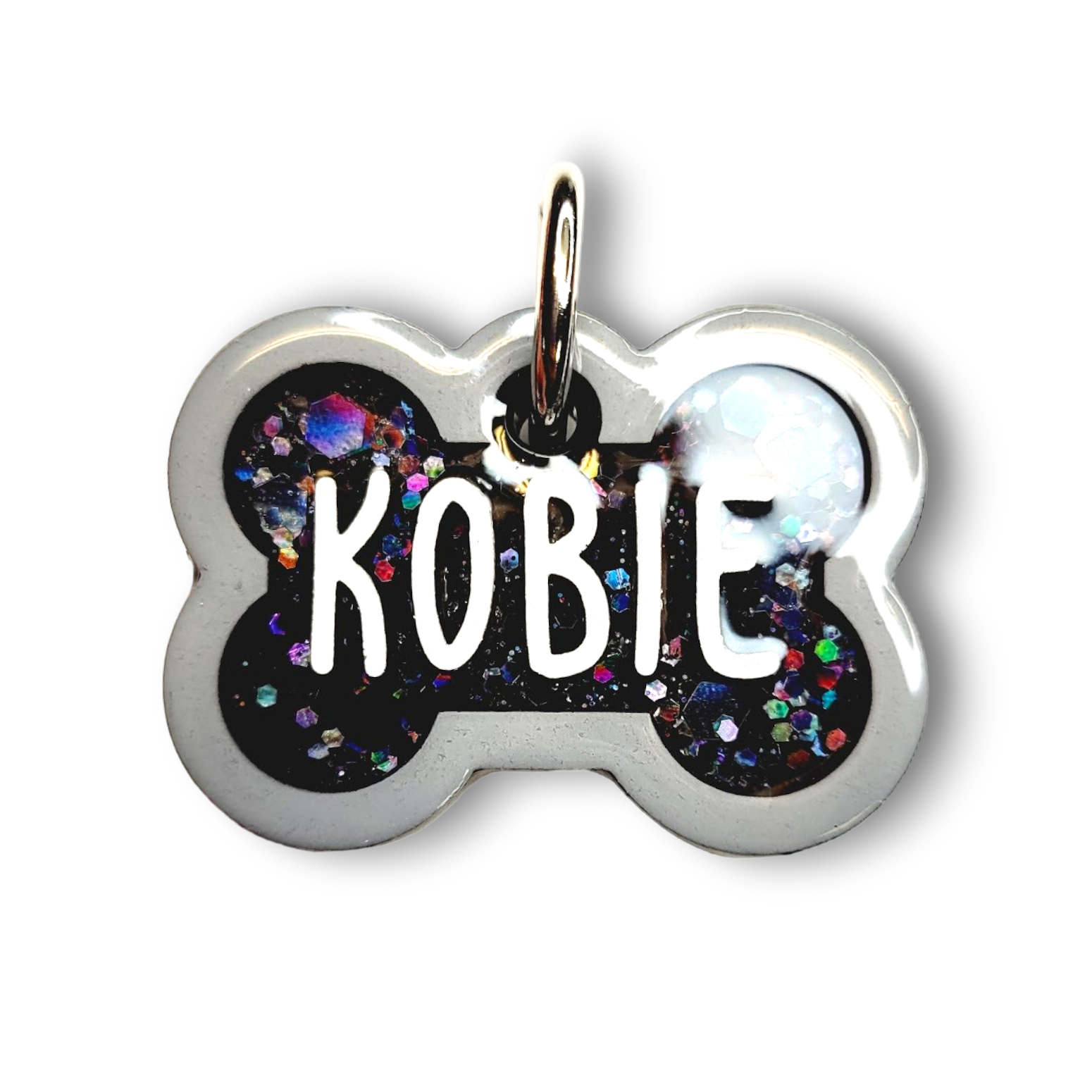 Our Poppin Select Series gives fur parents control over their customized tag. Choose from 16 colors and 12 sparkly fillings! Poppin Select Tags are approximately 1/4" thick- Please look at our tag size photo for full specs. Your pet's name will have a 3D effect and will POP! Each tag is hand painted and encased in UV Resin for durability and shine. Check out how they're made on our TikTok  & Instagram