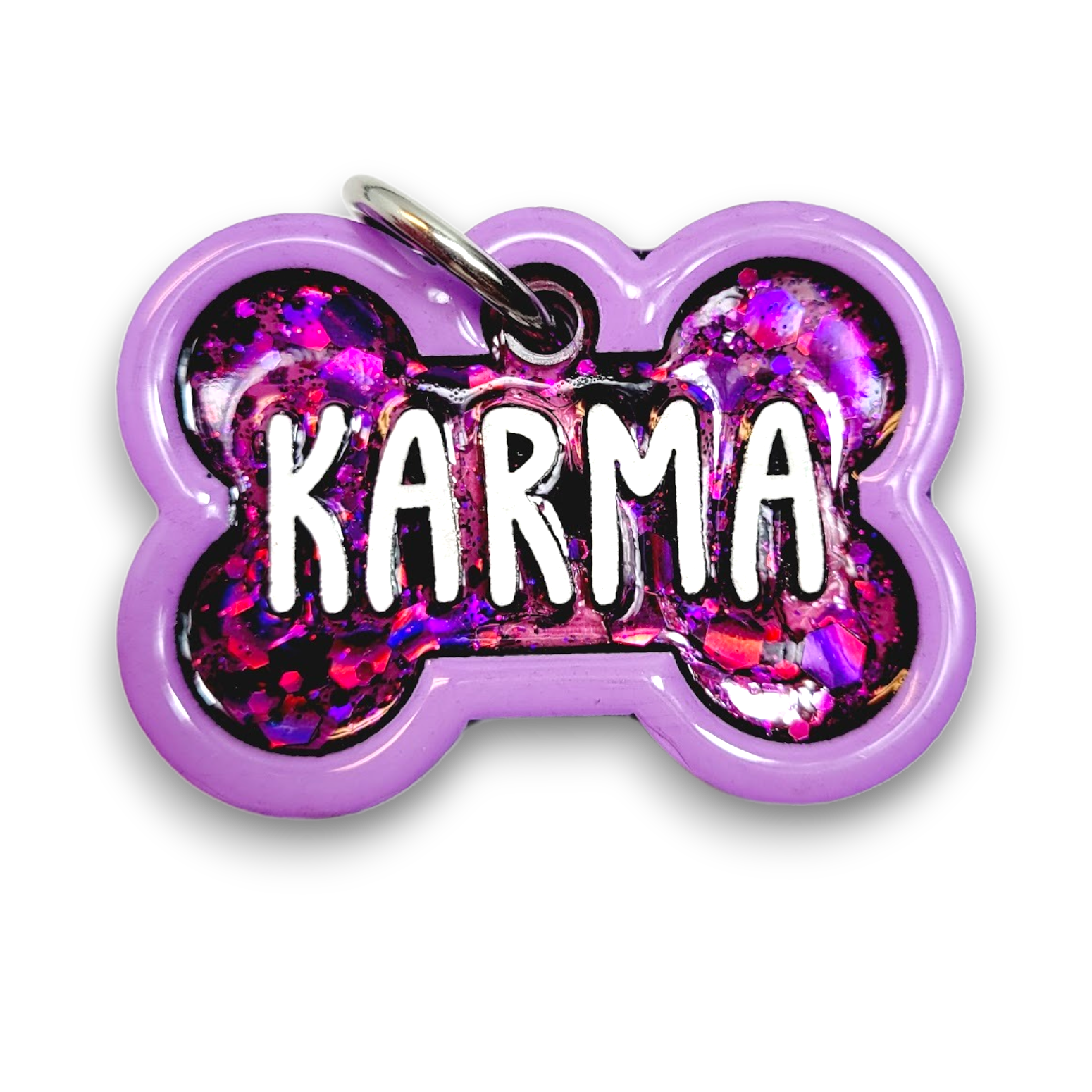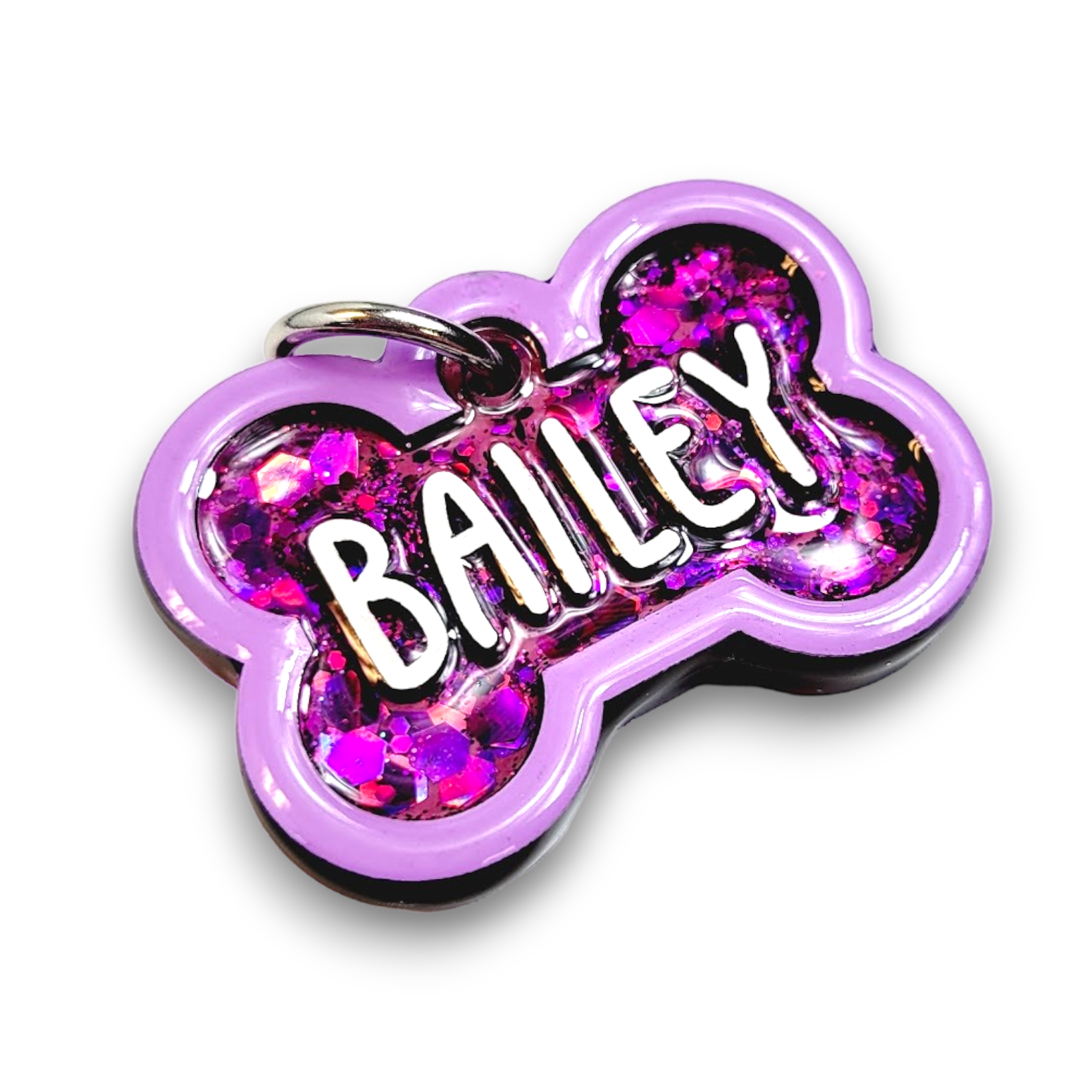 Our Poppin Select Series gives fur parents control over their customized tag. Choose from 16 colors and 12 sparkly fillings! Poppin Select Tags are approximately 1/4" thick- Please look at our tag size photo for full specs. Your pet's name will have a 3D effect and will POP! Each tag is hand painted and encased in UV Resin for durability and shine. Check out how they're made on our TikTok  & Instagram