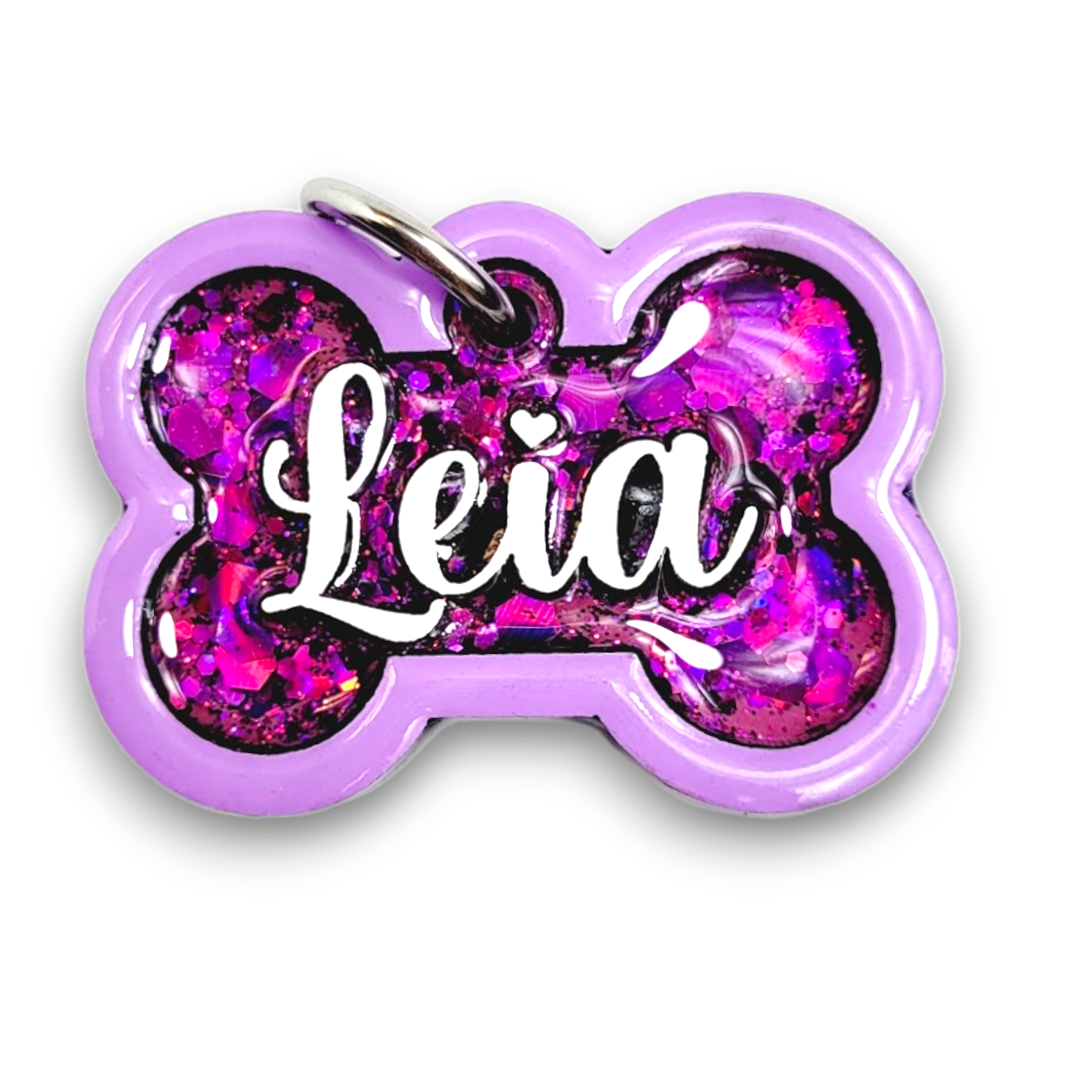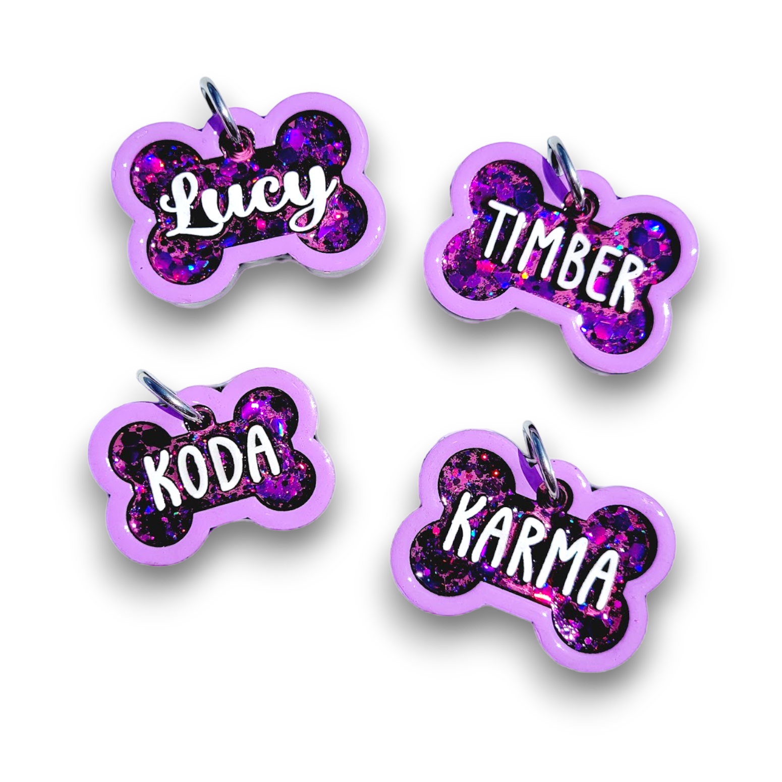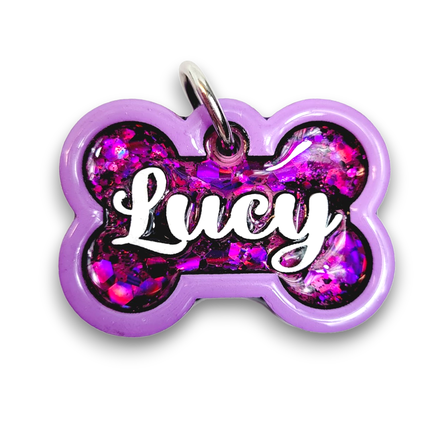 Our Poppin Select Series gives fur parents control over their customized tag. Choose from 16 colors and 12 sparkly fillings! Poppin Select Tags are approximately 1/4" thick- Please look at our tag size photo for full specs. Your pet's name will have a 3D effect and will POP! Each tag is hand painted and encased in UV Resin for durability and shine. Check out how they're made on our TikTok  & Instagram