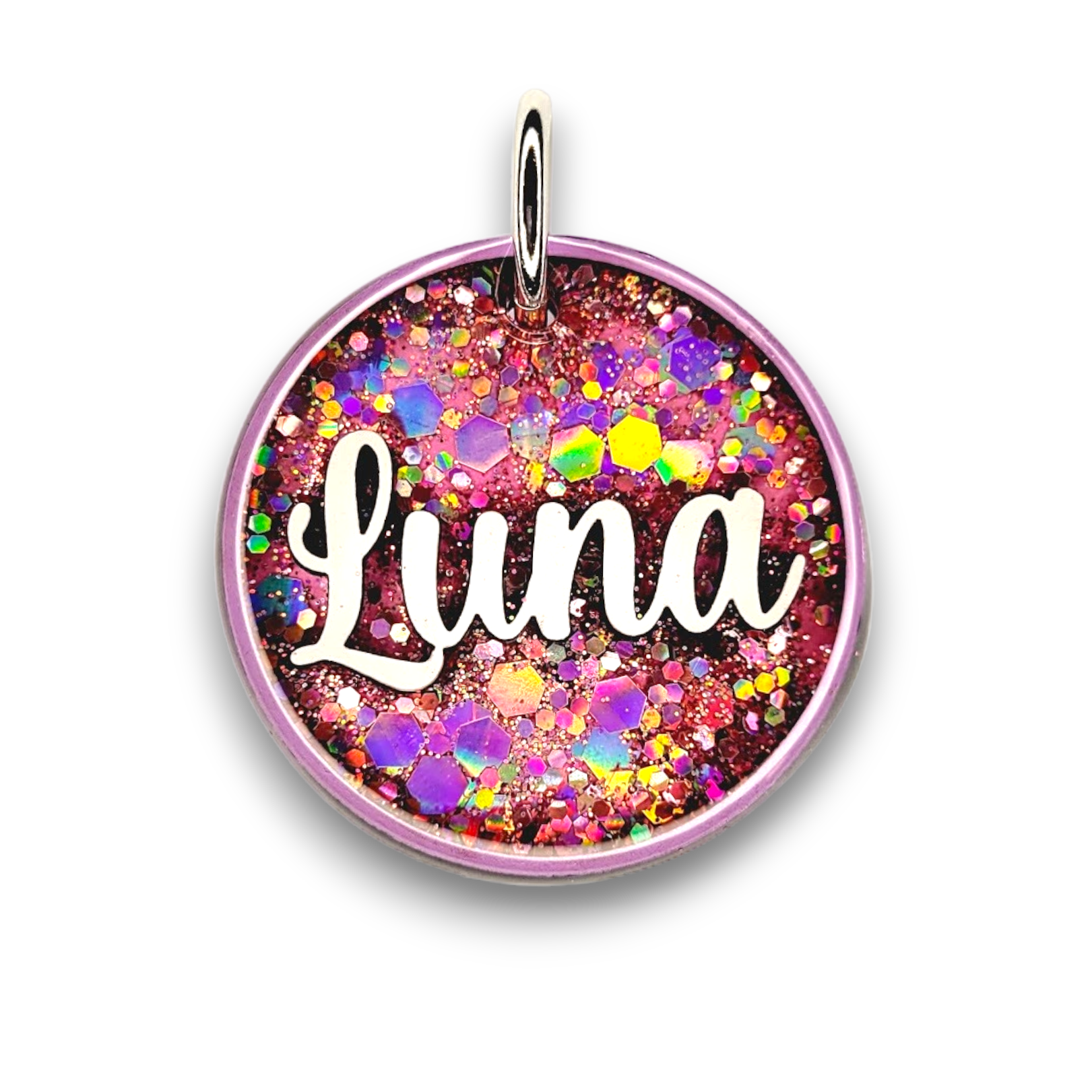Our Poppin Select Series gives fur parents control over their customized tag. Choose from 16 colors and 12 sparkly fillings! Poppin Select Tags are approximately 1/4" thick- Please look at our tag size photo for full specs. Your pet's name will have a 3D effect and will POP! Each tag is hand painted and encased in UV Resin for durability and shine. Check out how they're made on our TikTok  & Instagram