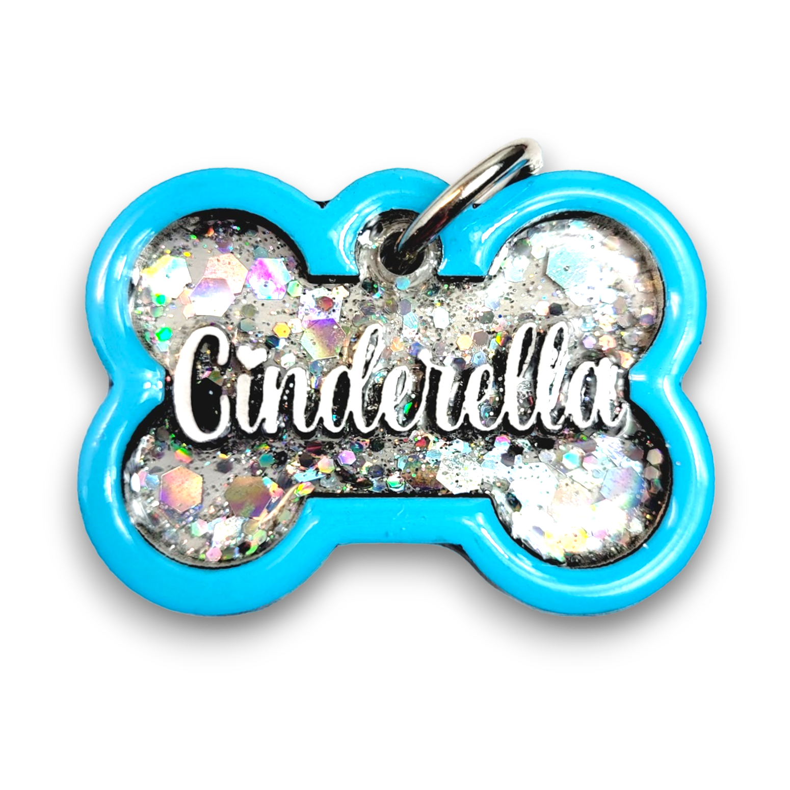 Our Poppin Select Series gives fur parents control over their customized tag. Choose from 16 colors and 12 sparkly fillings! Poppin Select Tags are approximately 1/4" thick- Please look at our tag size photo for full specs. Your pet's name will have a 3D effect and will POP! Each tag is hand painted and encased in UV Resin for durability and shine. Check out how they're made on our TikTok  & Instagram