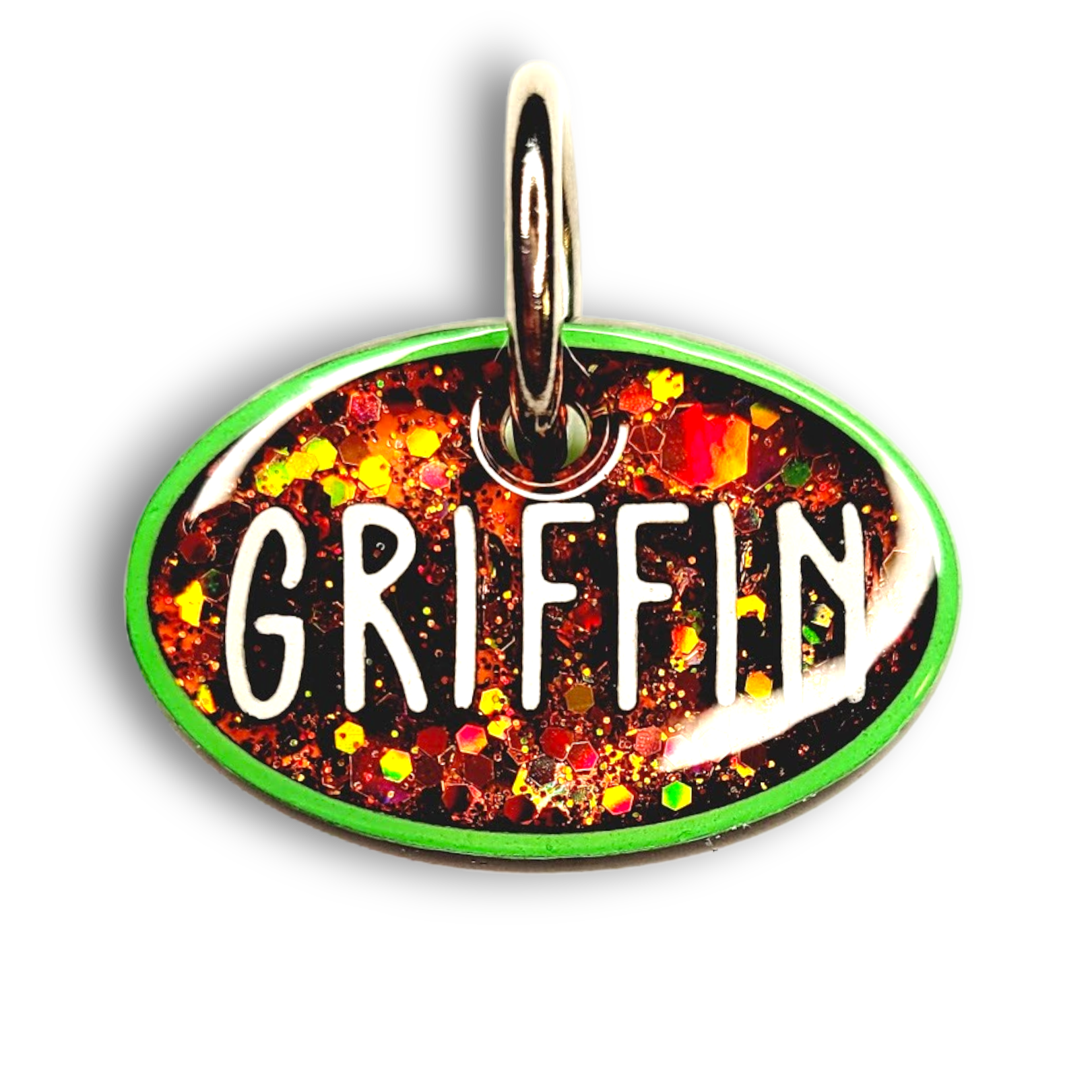 Our Poppin Select Series gives fur parents control over their customized tag. Choose from 16 colors and 12 sparkly fillings! Poppin Select Tags are approximately 1/4" thick- Please look at our tag size photo for full specs. Your pet's name will have a 3D effect and will POP! Each tag is hand painted and encased in UV Resin for durability and shine. Check out how they're made on our TikTok  & Instagram