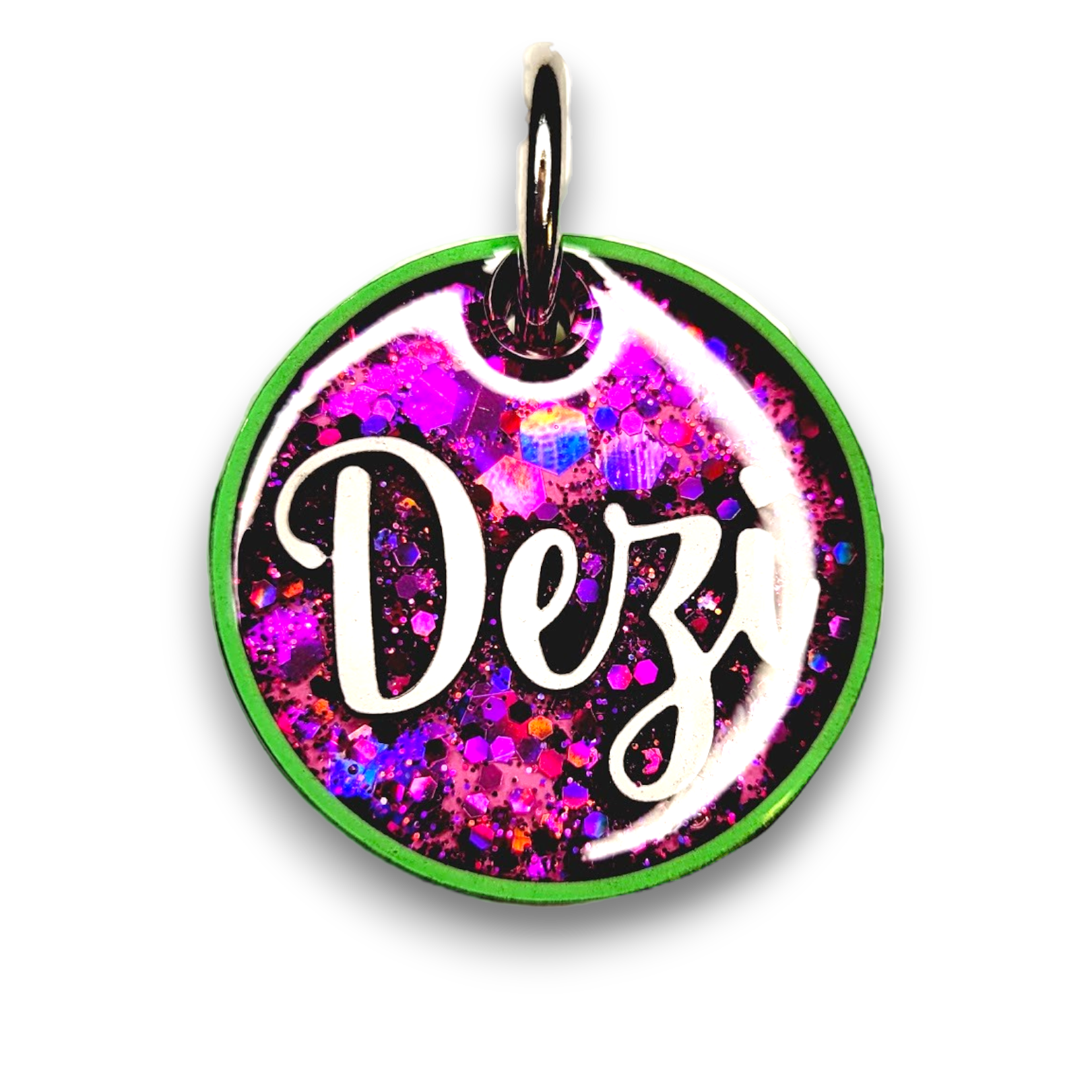 Our Poppin Select Series gives fur parents control over their customized tag. Choose from 16 colors and 12 sparkly fillings! Poppin Select Tags are approximately 1/4" thick- Please look at our tag size photo for full specs. Your pet's name will have a 3D effect and will POP! Each tag is hand painted and encased in UV Resin for durability and shine. Check out how they're made on our TikTok  & Instagram