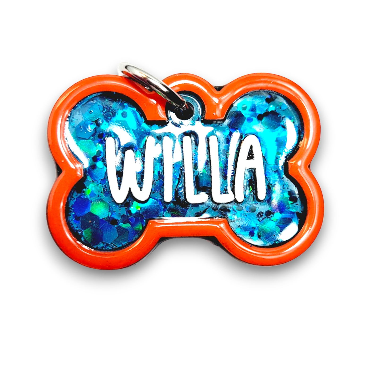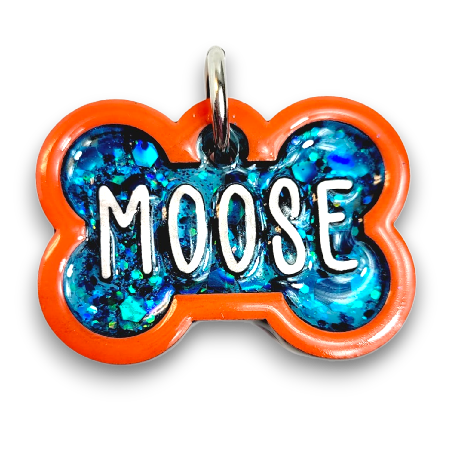 Our Poppin Select Series gives fur parents control over their customized tag. Choose from 16 colors and 12 sparkly fillings! Poppin Select Tags are approximately 1/4" thick- Please look at our tag size photo for full specs. Your pet's name will have a 3D effect and will POP! Each tag is hand painted and encased in UV Resin for durability and shine. Check out how they're made on our TikTok  & Instagram