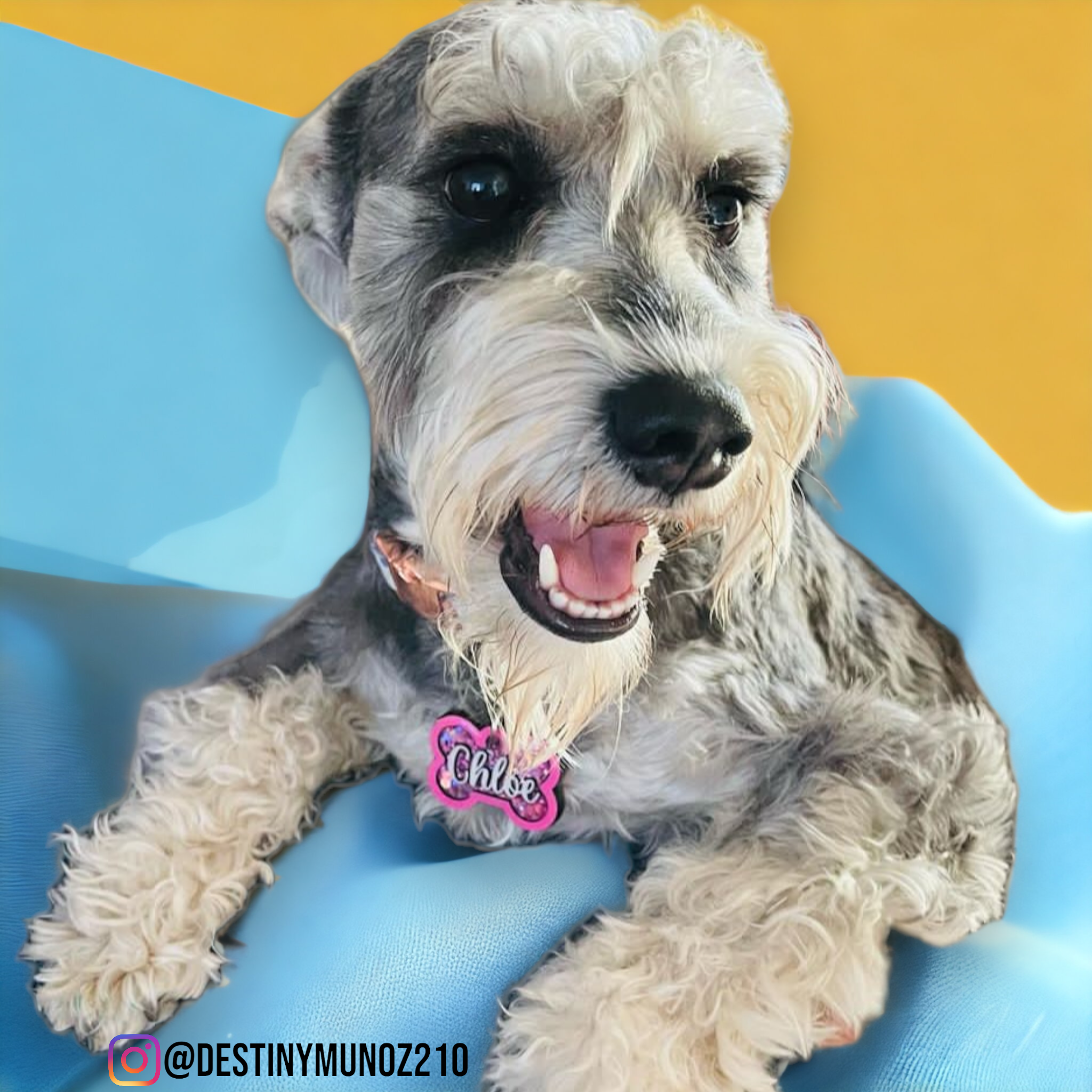 Our Poppin Select Series gives fur parents control over their customized tag. Choose from 16 colors and 12 sparkly fillings! Poppin Select Tags are approximately 1/4" thick- Please look at our tag size photo for full specs. Your pet's name will have a 3D effect and will POP! Each tag is hand painted and encased in UV Resin for durability and shine. Check out how they're made on our TikTok  & Instagram