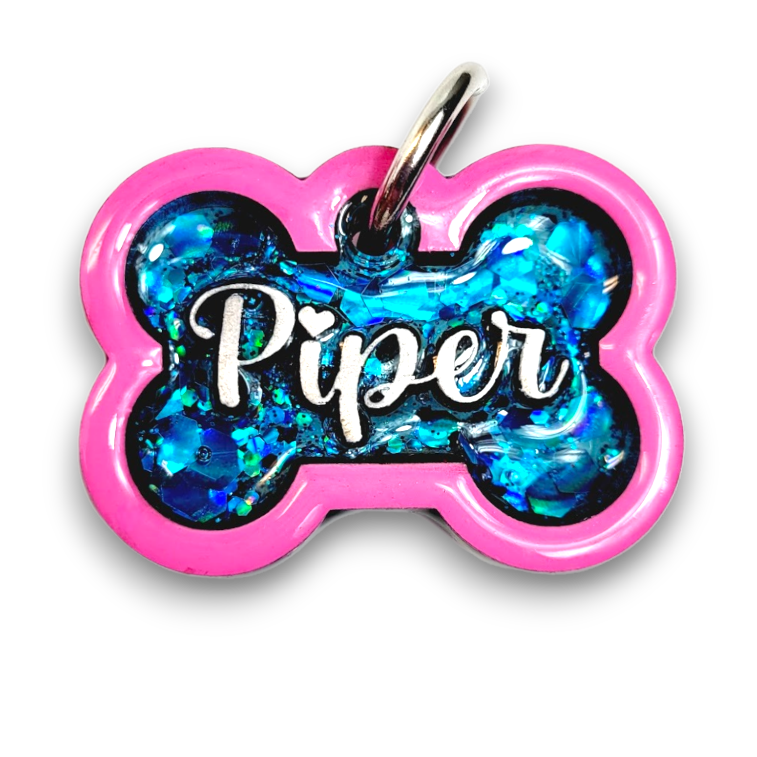 Our Poppin Select Series gives fur parents control over their customized tag. Choose from 16 colors and 12 sparkly fillings! Poppin Select Tags are approximately 1/4" thick- Please look at our tag size photo for full specs. Your pet's name will have a 3D effect and will POP! Each tag is hand painted and encased in UV Resin for durability and shine. Check out how they're made on our TikTok  & Instagram