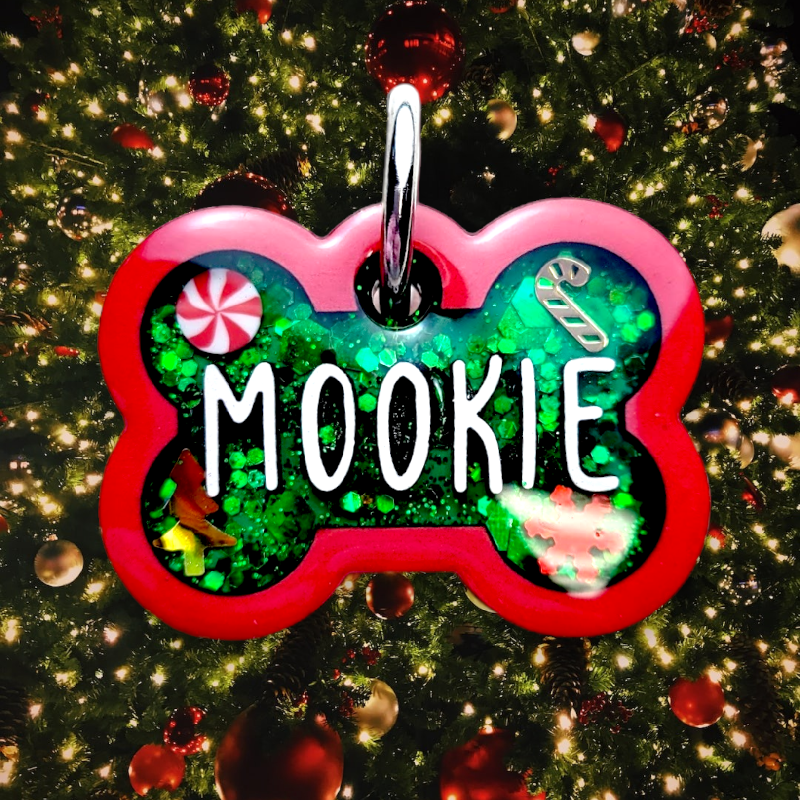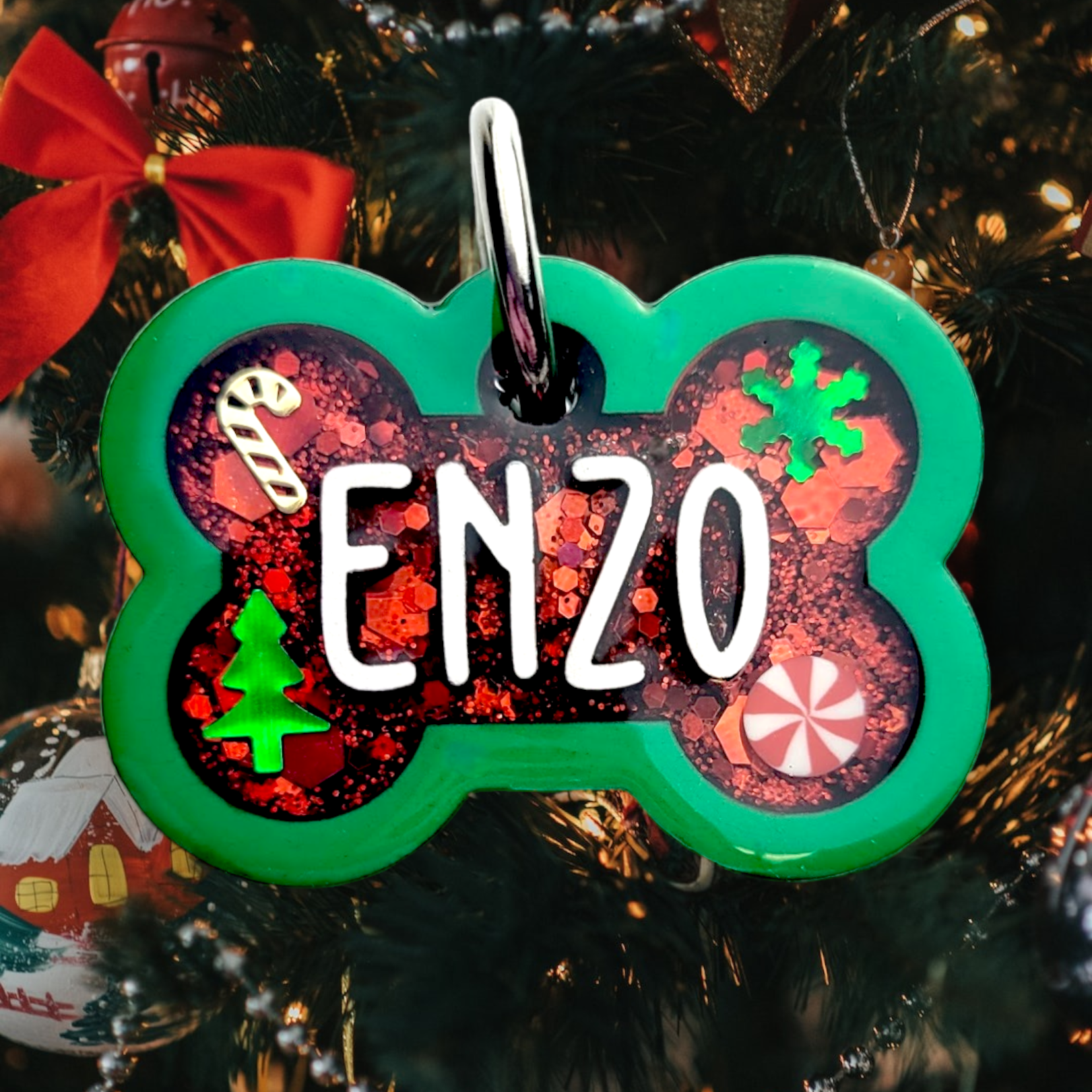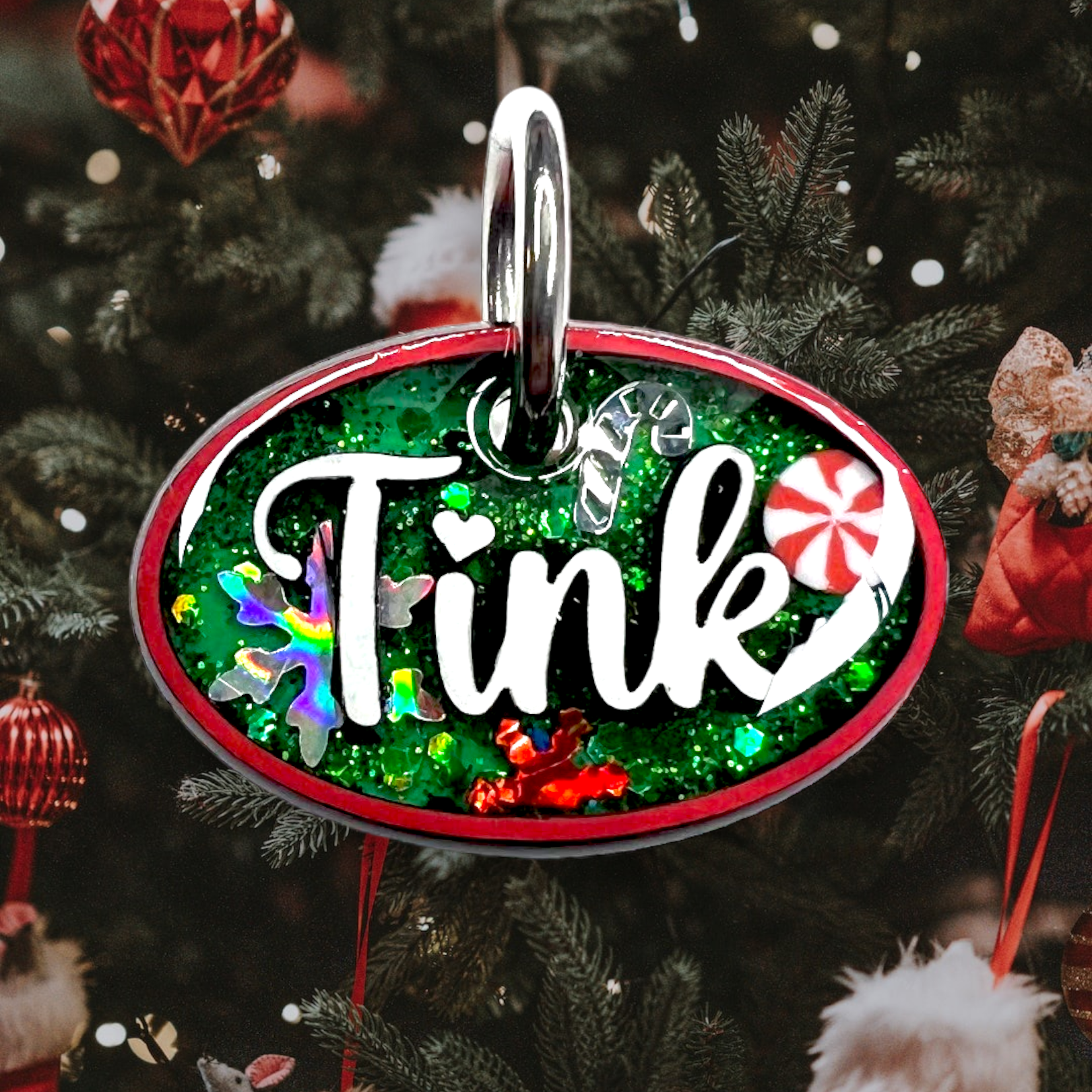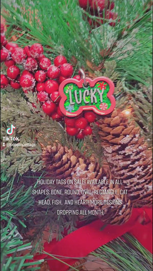 Our Poppin Premium Holiday Series are predesigned tags created in collaboration with VIP clients and social media partners. Sign up for our email list and follow our social media accounts for drop announcements! Poppin Premium Tags are approximately 1/4" thick- Please look at our tag size photo for full specs. Your pet's name will have a 3D effect and will POP! Each tag is hand painted and encased in UV Resin for durability and shine. Check out how they're made on our TikTok & Instagram!