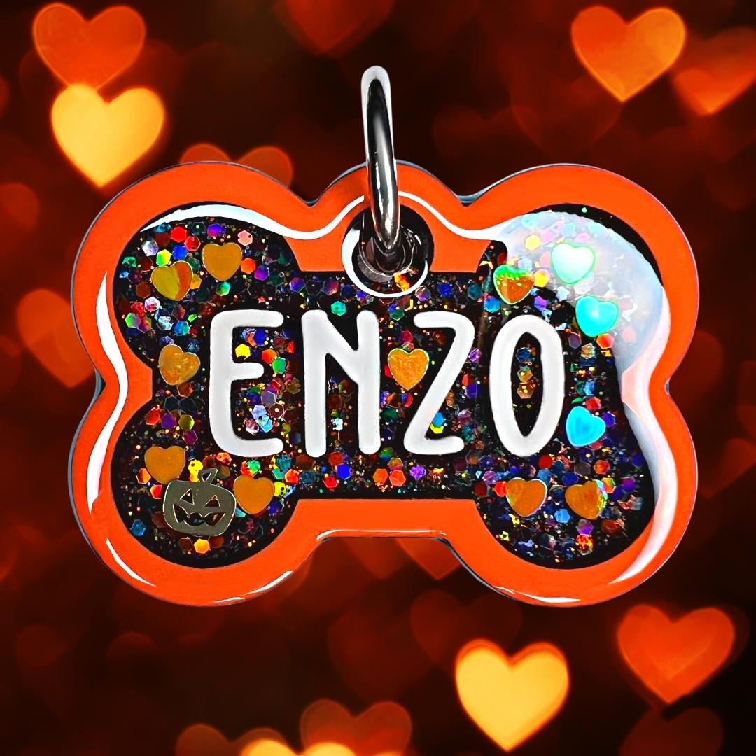 Our Poppin Premium Halloween Series are predesigned tags created in collaboration with VIP clients and social media partners. Sign up for our email list and follow our social media accounts for drop announcements! Poppin Premium Tags are approximately 1/4" thick- Please look at our tag size photo for full specs. Your pet's name will have a 3D effect and will POP! Each tag is hand painted and encased in UV Resin for durability and shine. Check out how they're made on our TikTok  & Instagram