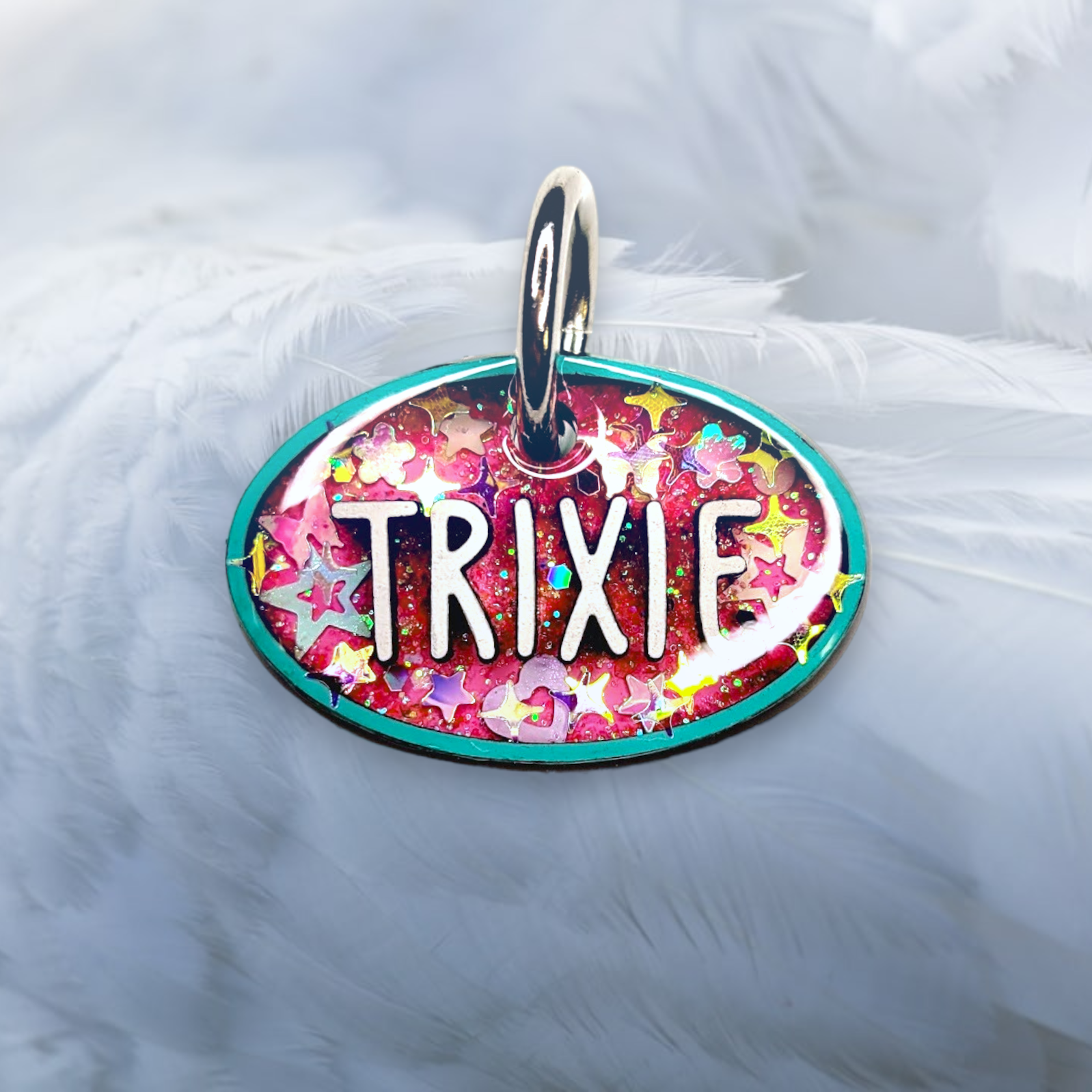 Our Poppin Premium Series are predesigned tags created in collaboration with VIP clients and social media partners. Sign up for our email list and follow our social media accounts for drop announcements! Poppin Premium Tags are approximately 1/4" thick- Please look at our tag size photo for full specs. Your pet's name will have a 3D effect and will POP! Each tag is hand painted and encased in UV Resin for durability and shine. Check out how they're made on our TikTok & Instagram!