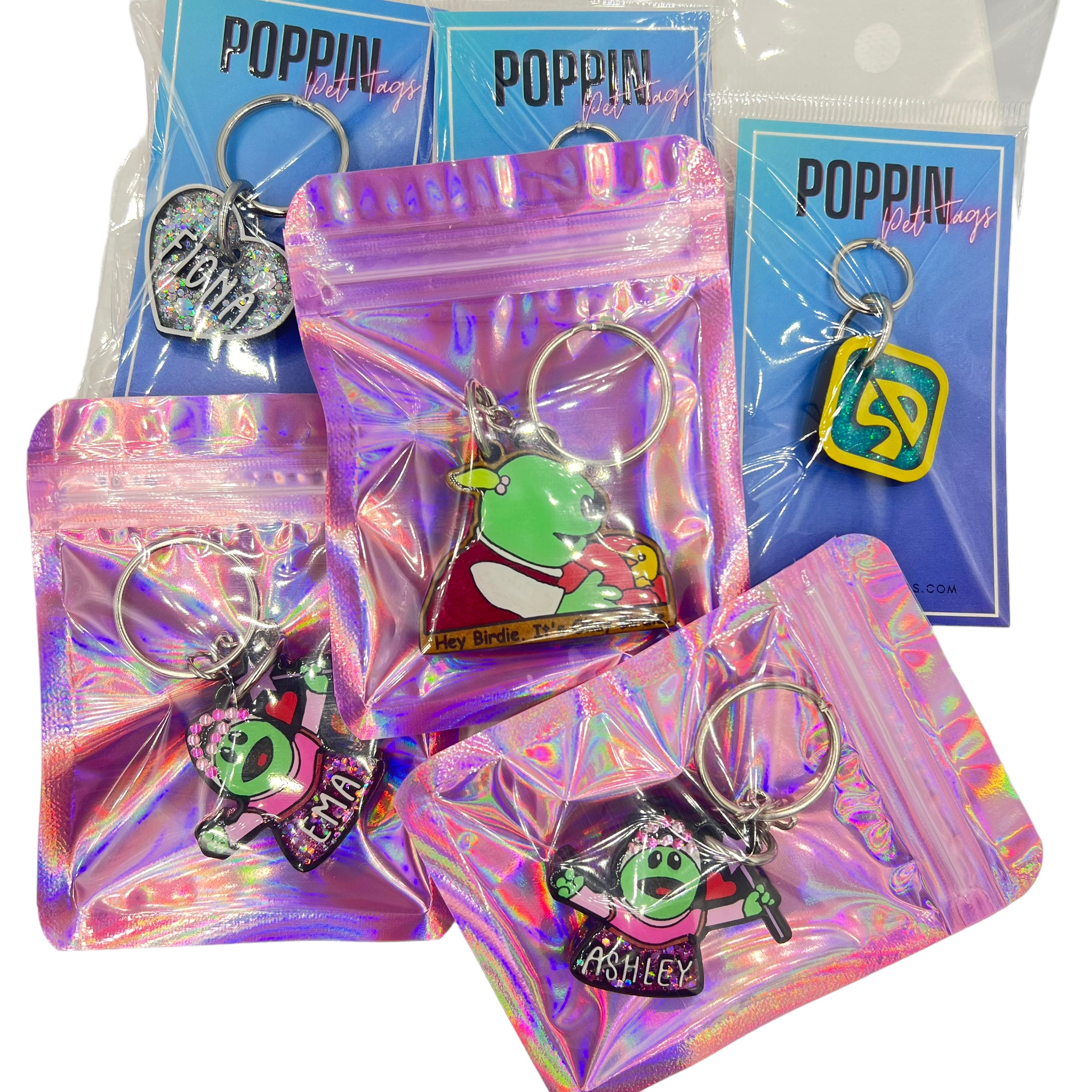 Our Poppin Premium Series are predesigned tags created in collaboration with VIP clients and social media partners. Sign up for our email list and follow our social media accounts for drop announcements! Poppin Premium Tags are approximately 1/4" thick- Please look at our tag size photo for full specs. Your pet's name will have a 3D effect and will POP! Each tag is hand painted and encased in UV Resin for durability and shine. Check out how they're made on our TikTok  & Instagram