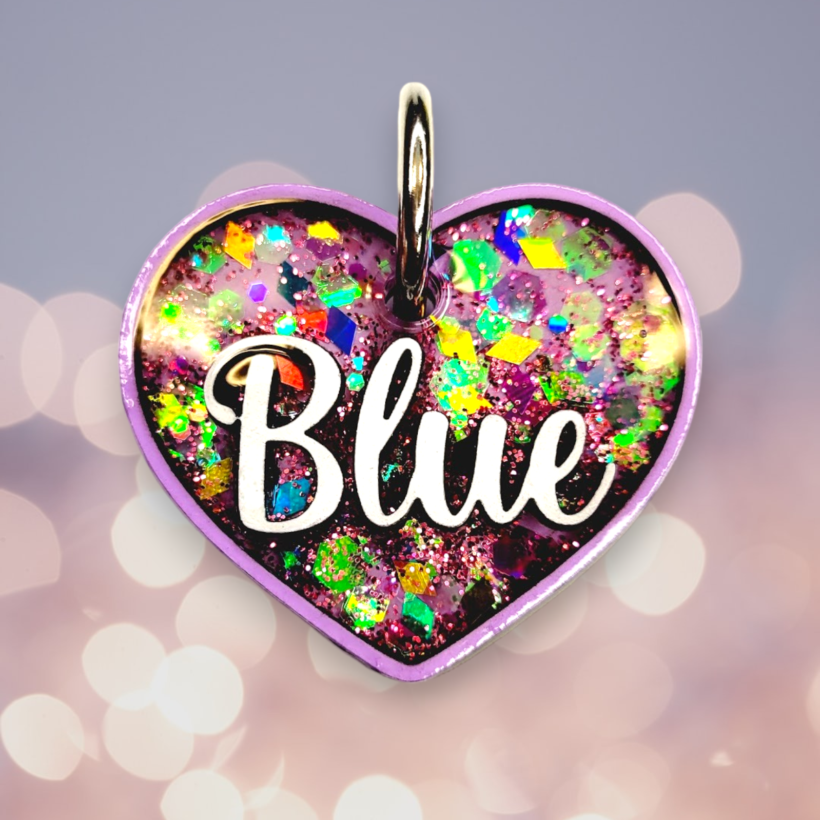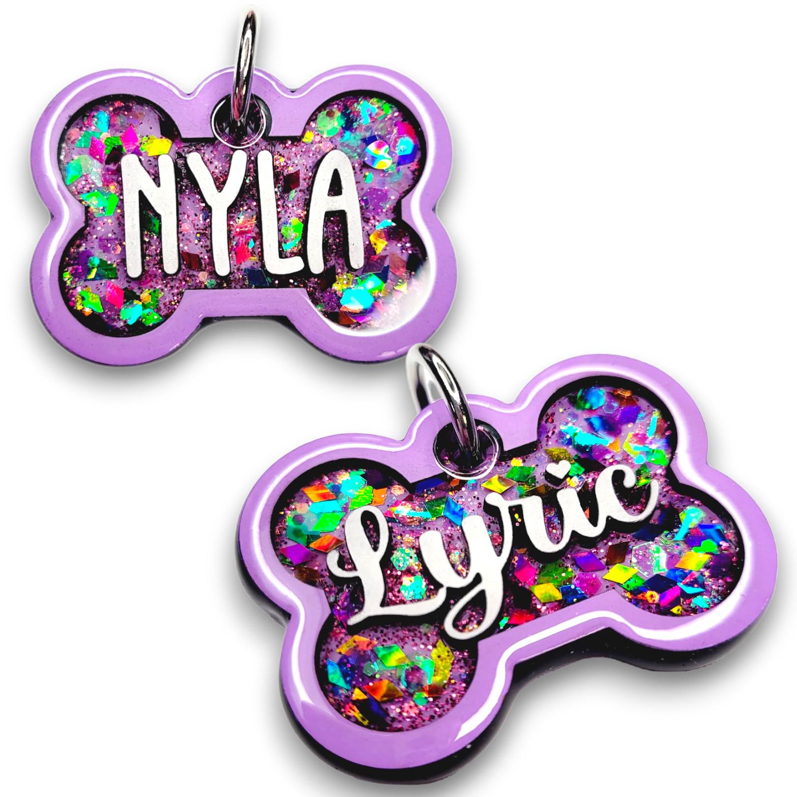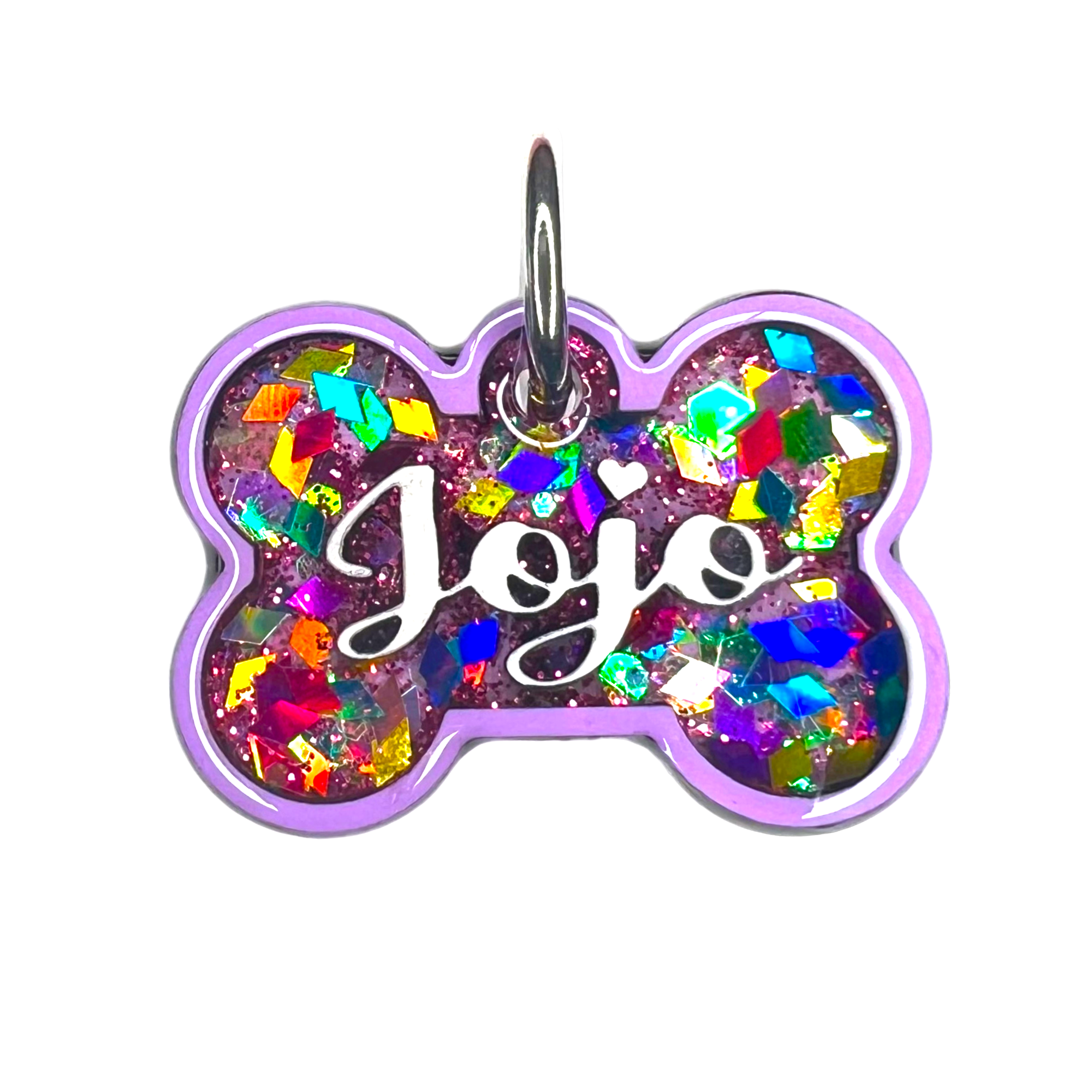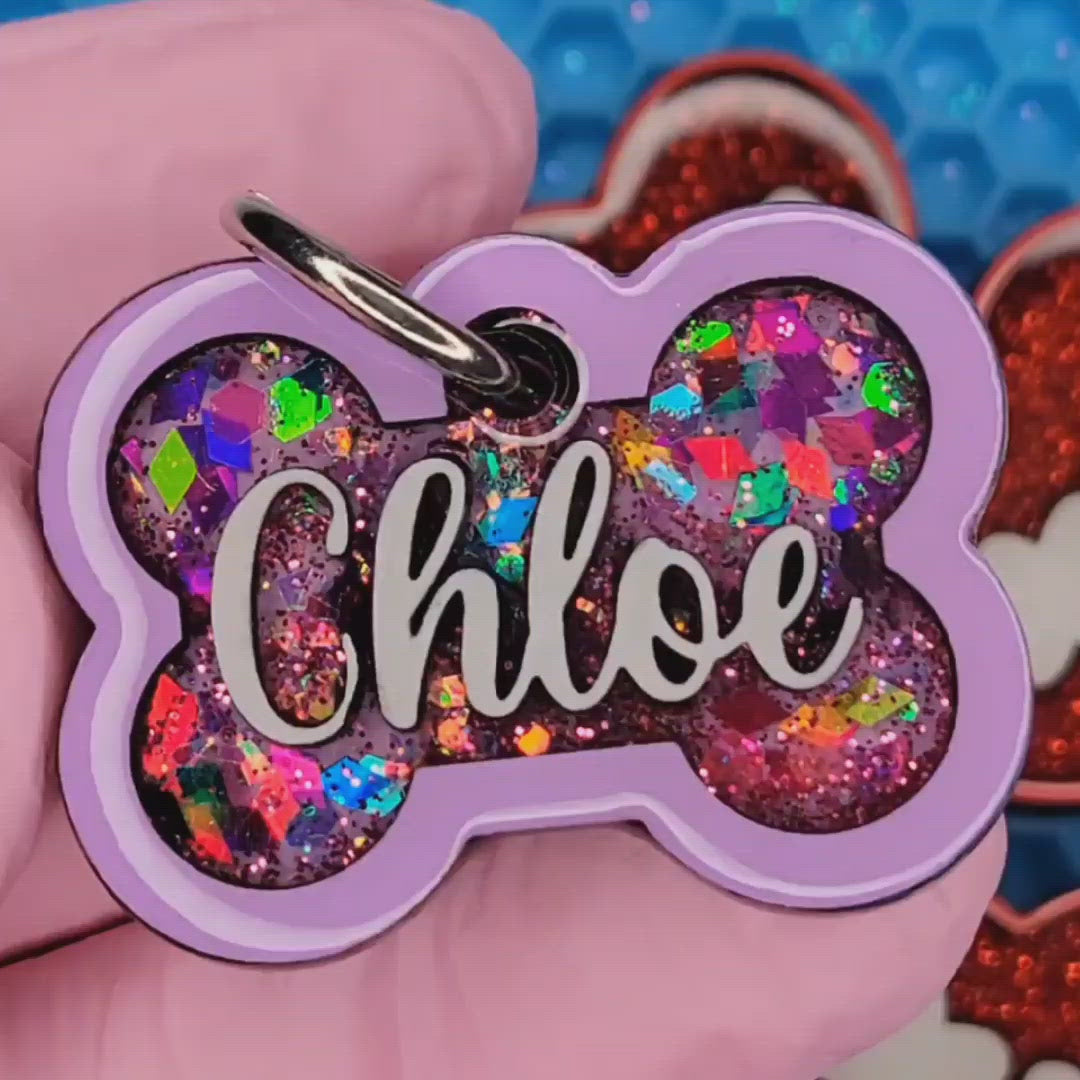 Our Poppin Premium Series are predesigned tags created in collaboration with VIP clients and social media partners. Sign up for our email list and follow our social media accounts for drop announcements! Poppin Premium Tags are approximately 1/4" thick- Please look at our tag size photo for full specs. Your pet's name will have a 3D effect and will POP! Each tag is hand painted and encased in UV Resin for durability and shine. Check out how they're made on our TikTok  & Instagram