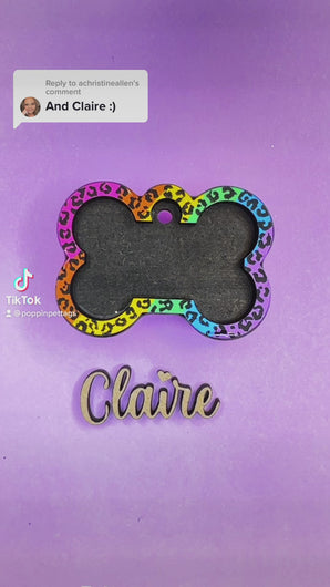 Our Poppin Premium Series are predesigned tags created in collaboration with VIP clients and social media partners. Sign up for our email list and follow our social media accounts for drop announcements! Poppin Premium Tags are approximately 1/4" thick- Please look at our tag size photo for full specs. Your pet's name will have a 3D effect and will POP! Each tag is hand painted and encased in UV Resin for durability and shine. Check out how they're made on our TikTok & Instagram!