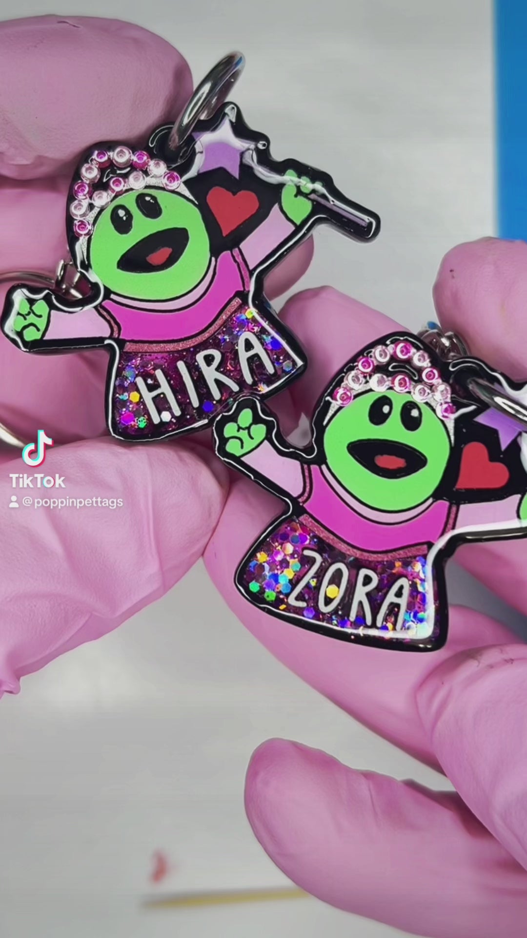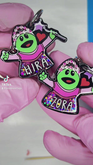 Our Poppin Premium Series are predesigned tags created in collaboration with VIP clients and social media partners. Sign up for our email list and follow our social media accounts for drop announcements! Poppin Premium Tags are approximately 1/4" thick- Please look at our tag size photo for full specs. Your pet's name will have a 3D effect and will POP! Each tag is hand painted and encased in UV Resin for durability and shine. Check out how they're made on our TikTok  & Instagram