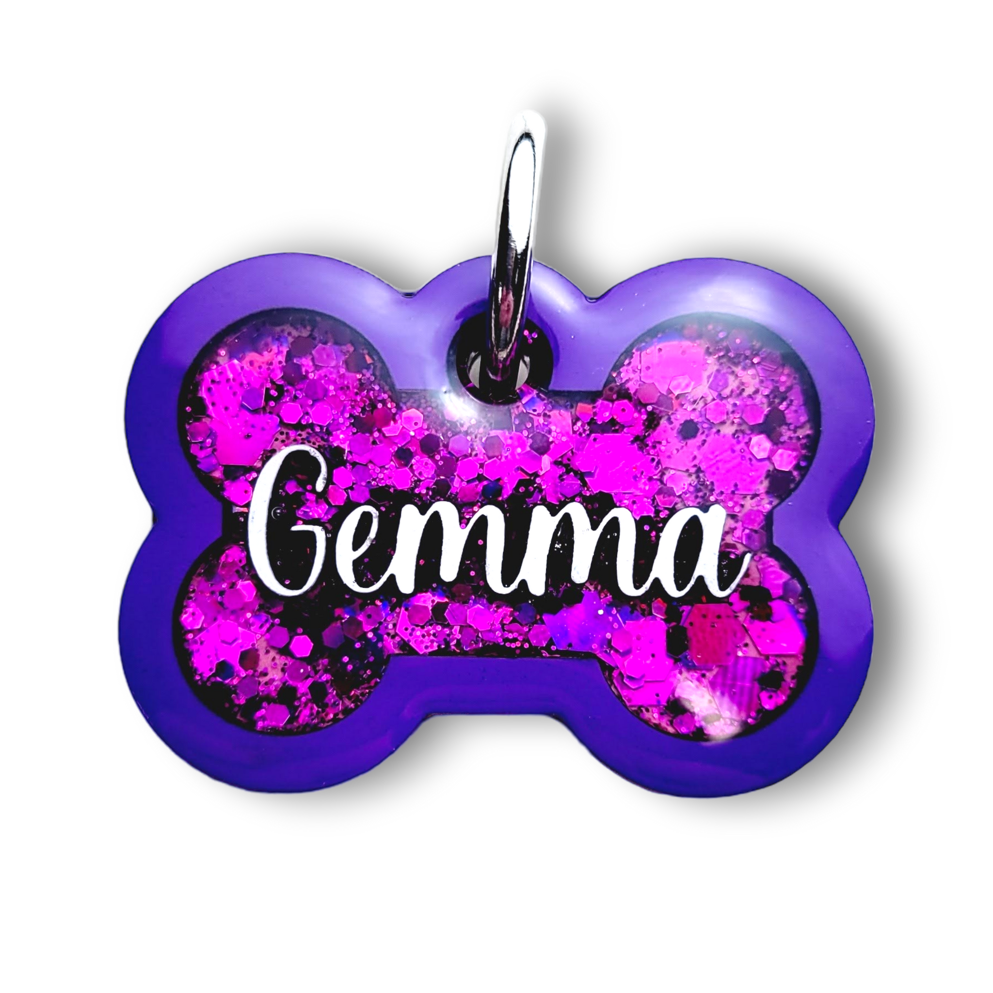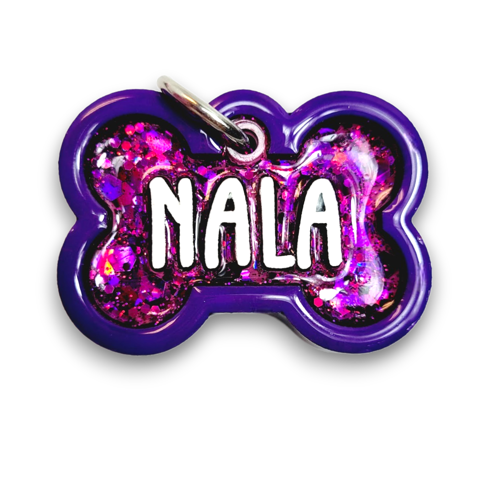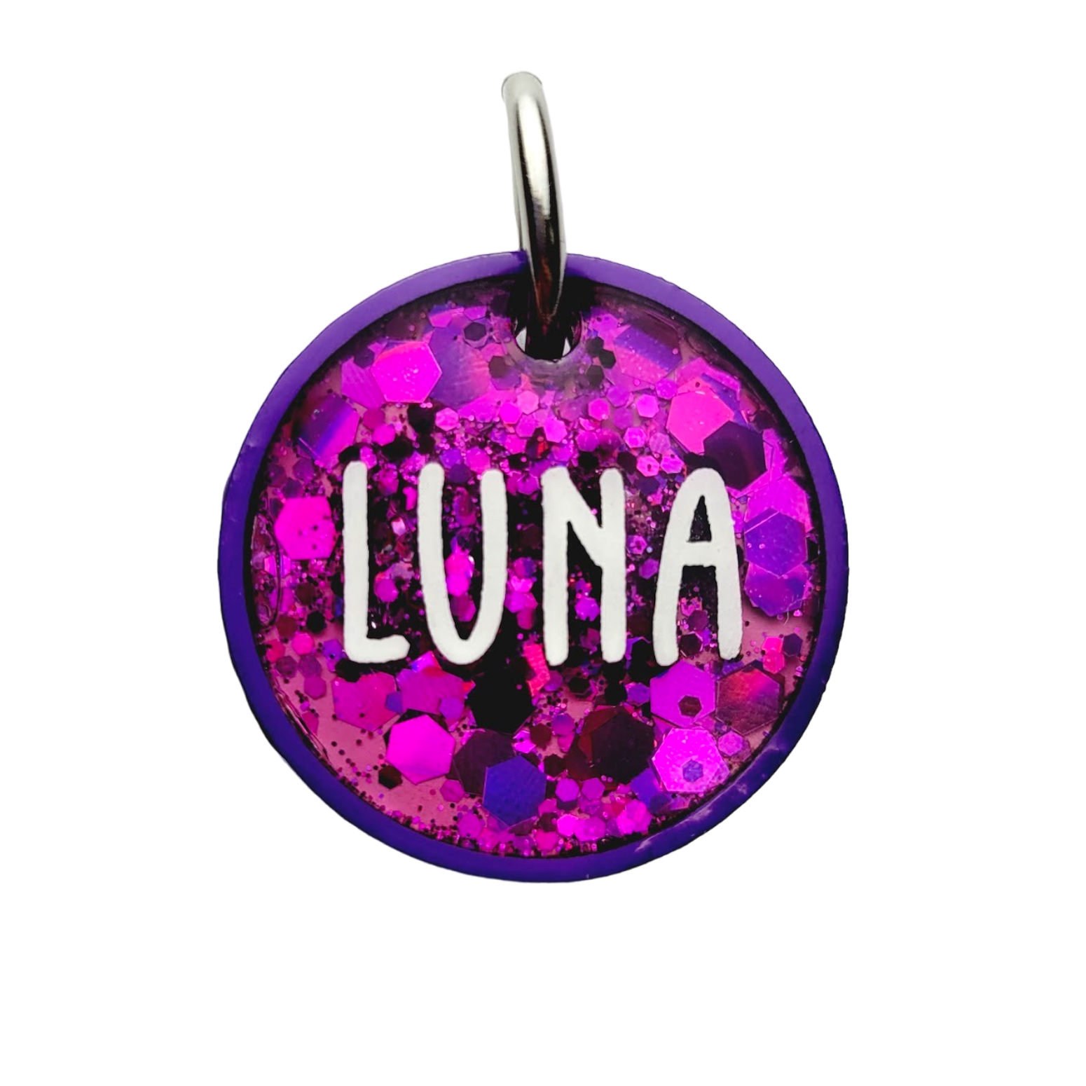 Our Poppin Select Series gives fur parents control over their customized tag. Choose from 16 colors and 12 sparkly fillings! Poppin Select Tags are approximately 1/4" thick- Please look at our tag size photo for full specs. Your pet's name will have a 3D effect and will POP! Each tag is hand painted and encased in UV Resin for durability and shine. Check out how they're made on our TikTok  & Instagram