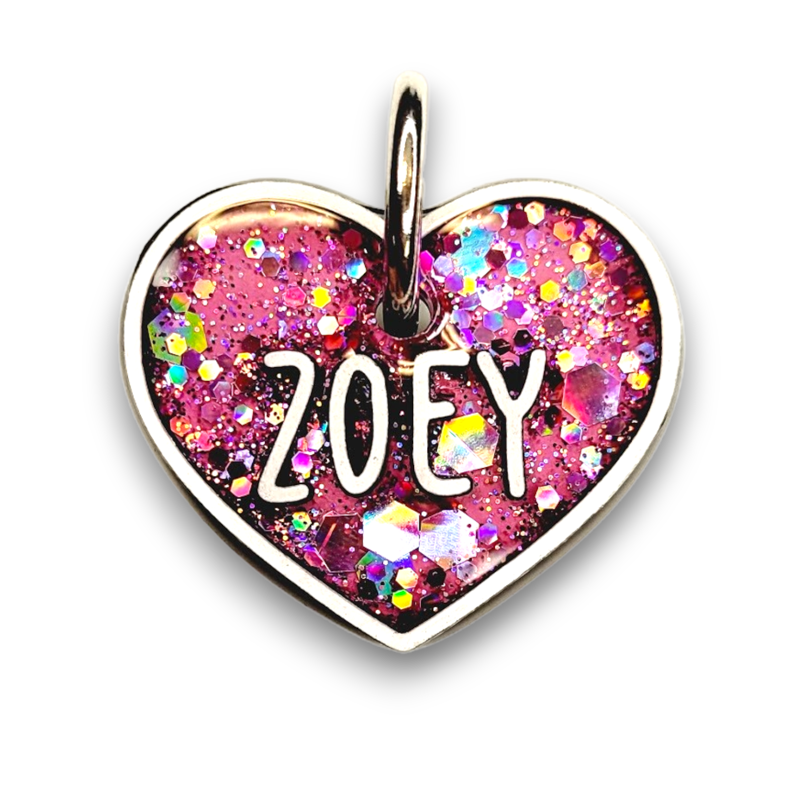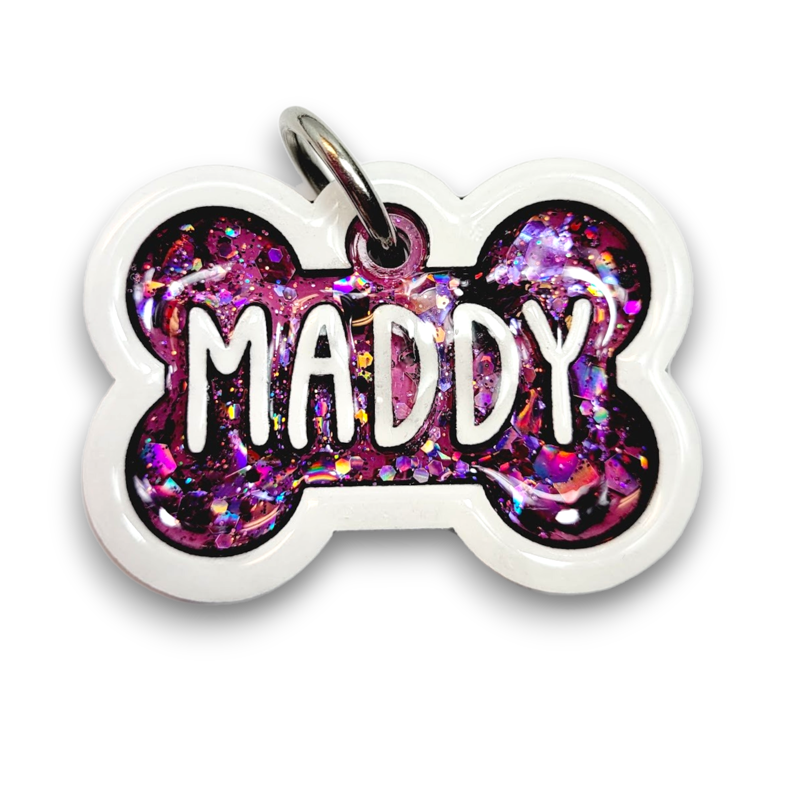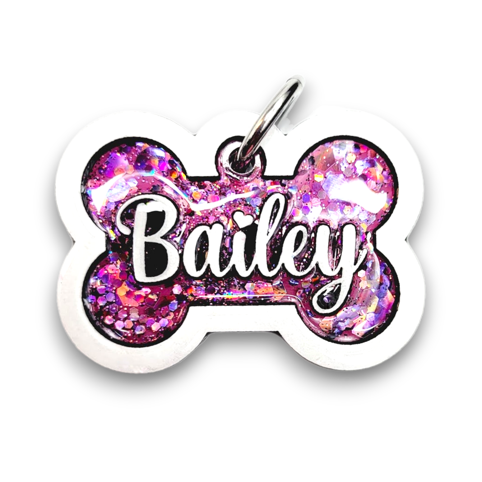 Our Poppin Select Series gives fur parents control over their customized tag. Choose from 16 colors and 12 sparkly fillings! Poppin Select Tags are approximately 1/4" thick- Please look at our tag size photo for full specs. Your pet's name will have a 3D effect and will POP! Each tag is hand painted and encased in UV Resin for durability and shine. Check out how they're made on our TikTok  & Instagram