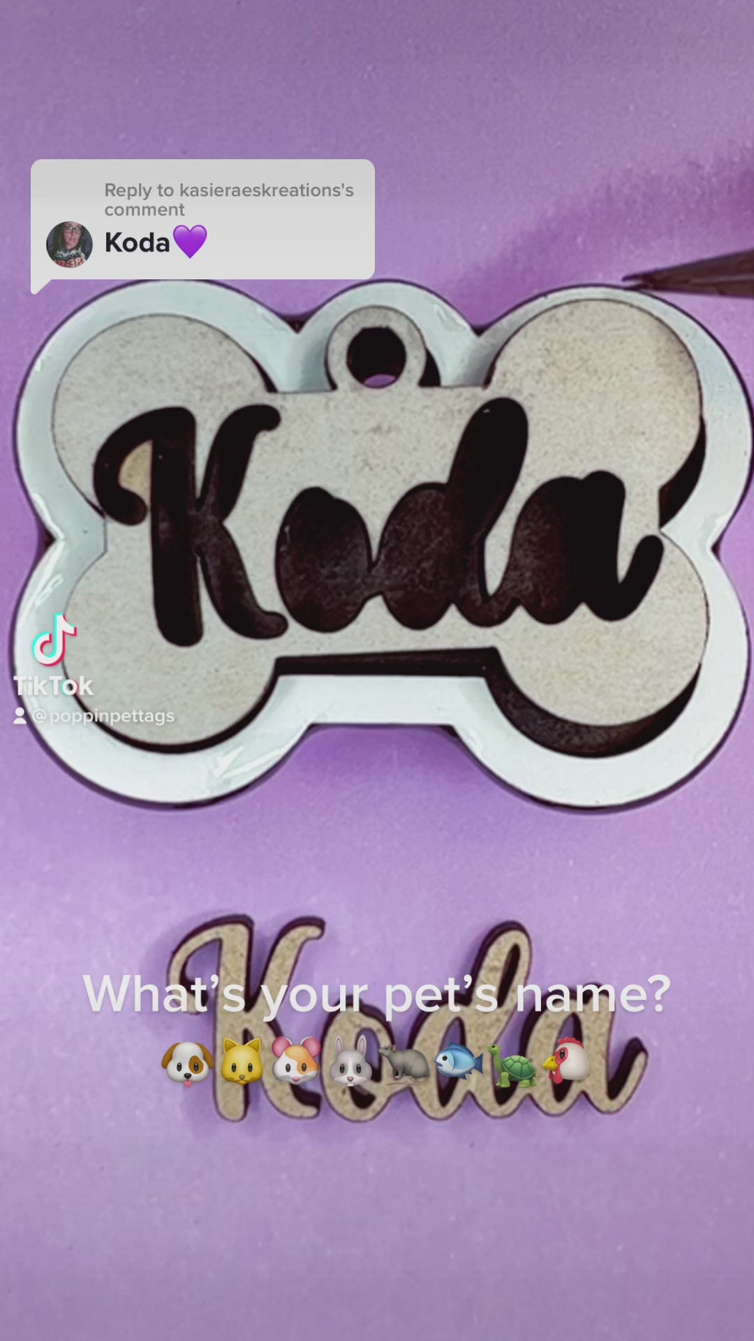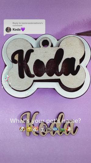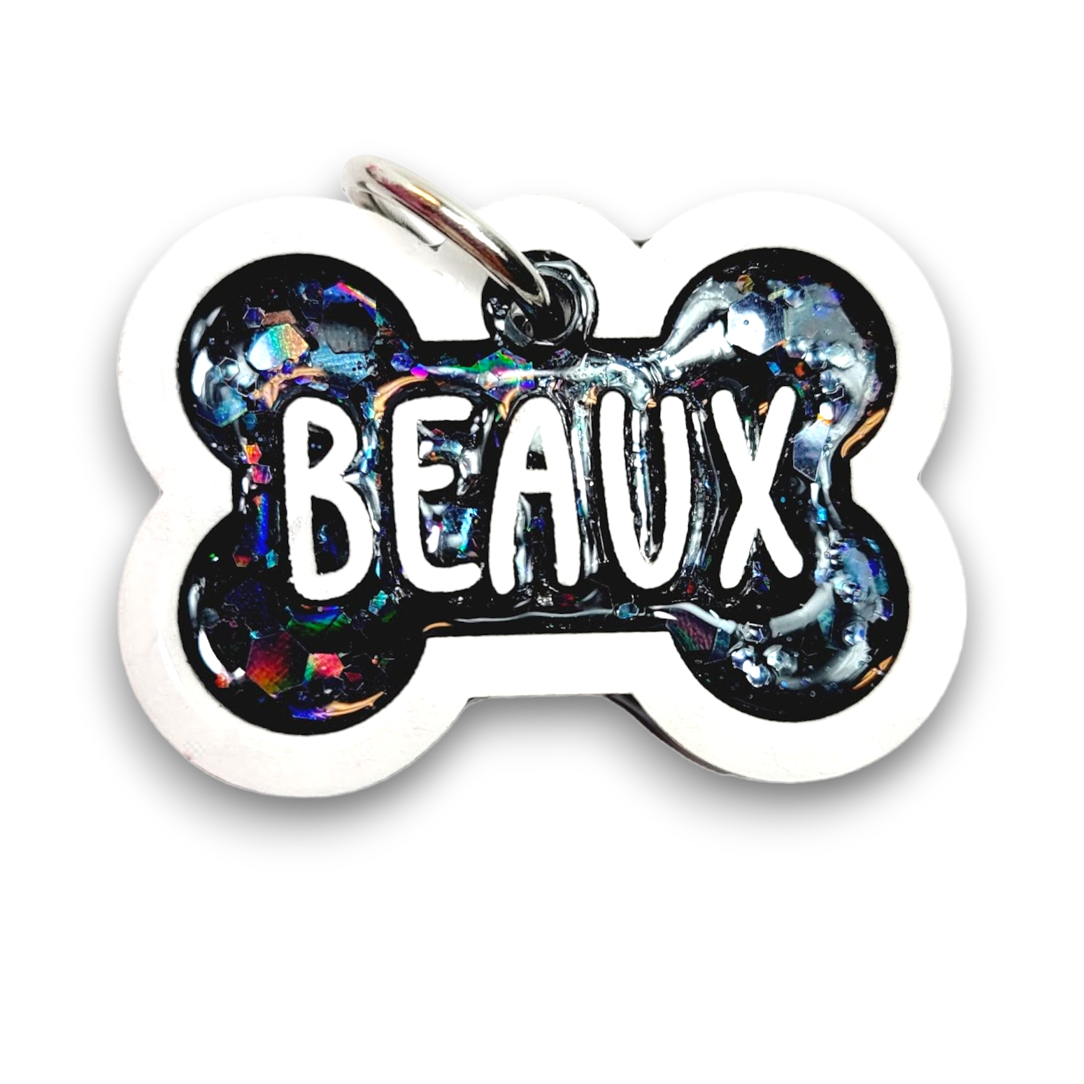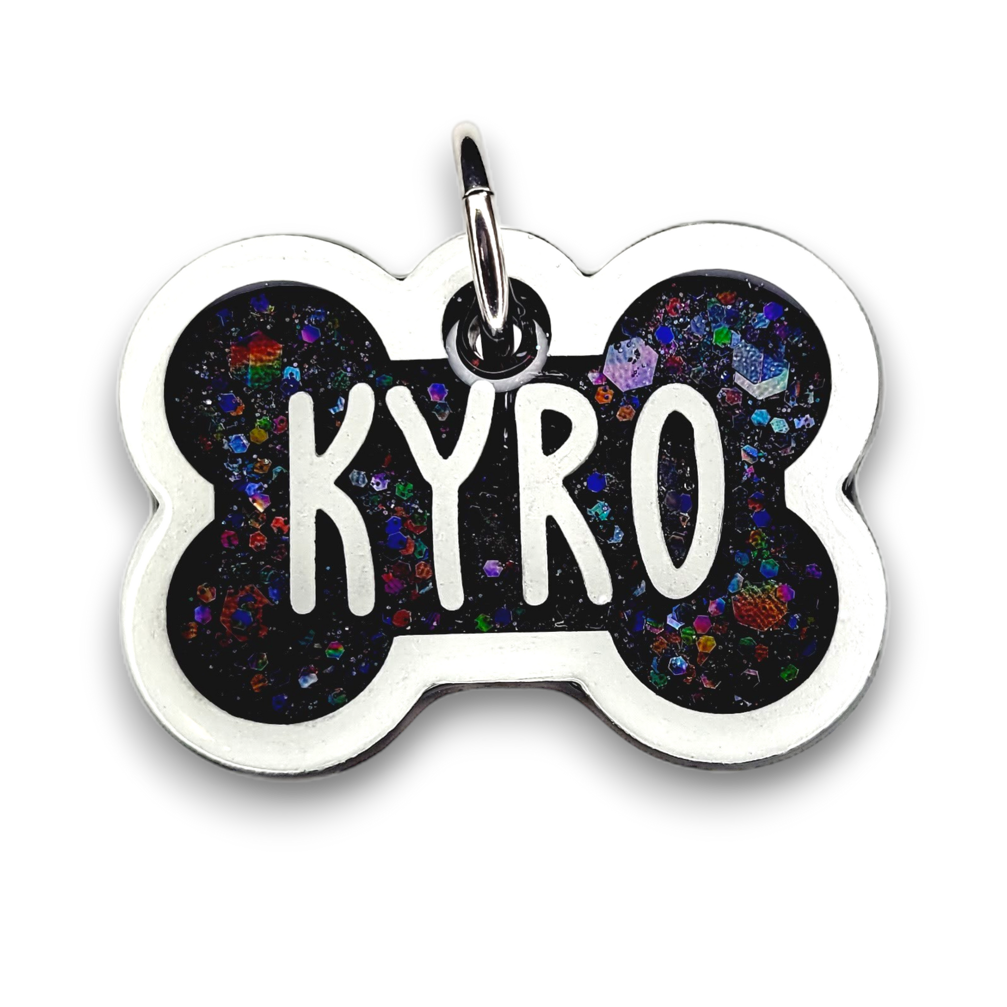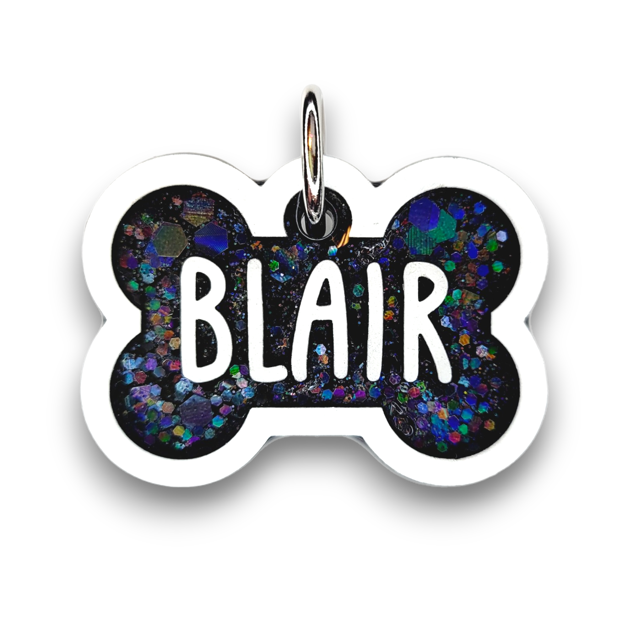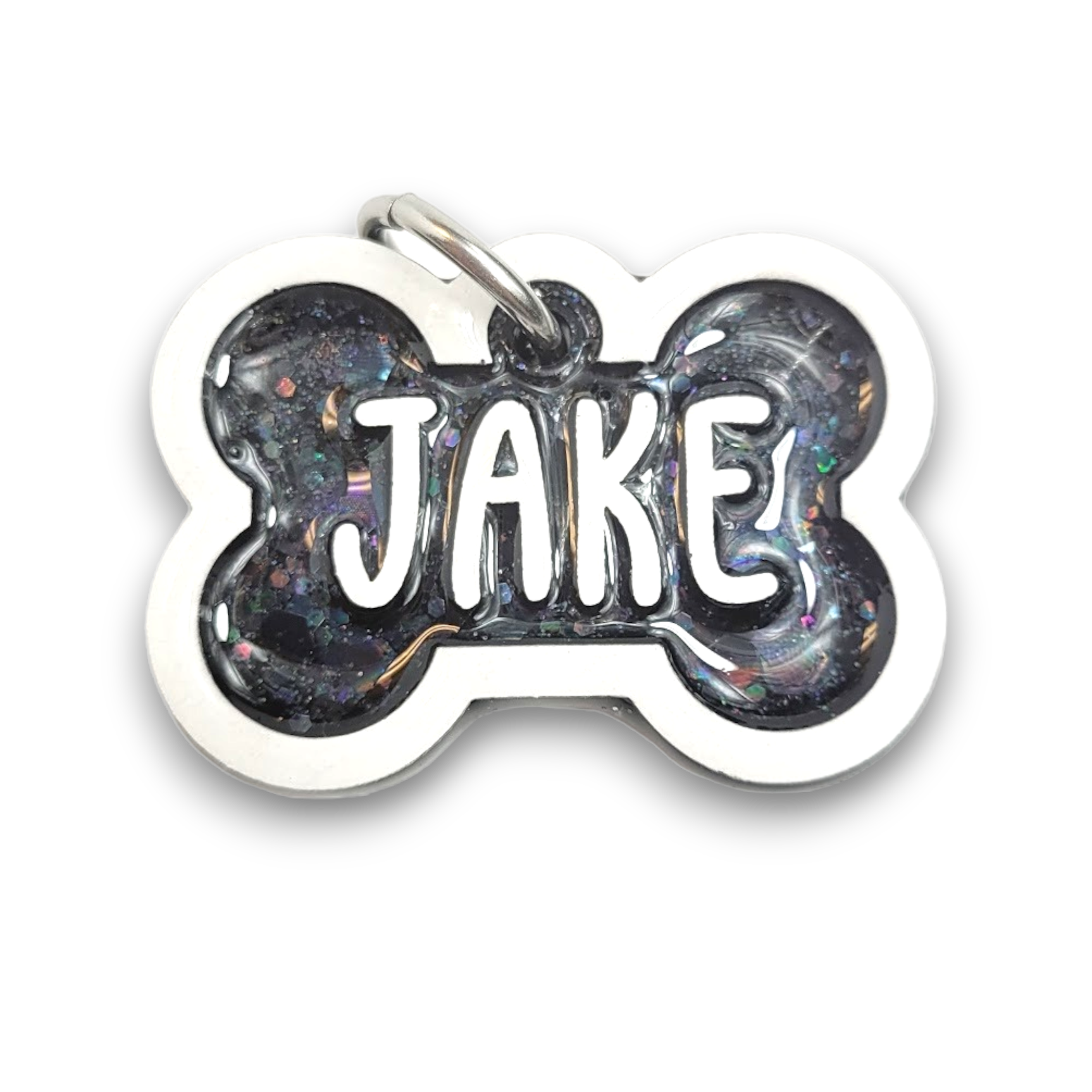 Our Poppin Select Series gives fur parents control over their customized tag. Choose from 16 colors and 12 sparkly fillings! Poppin Select Tags are approximately 1/4" thick- Please look at our tag size photo for full specs. Your pet's name will have a 3D effect and will POP! Each tag is hand painted and encased in UV Resin for durability and shine. Check out how they're made on our TikTok  & Instagram