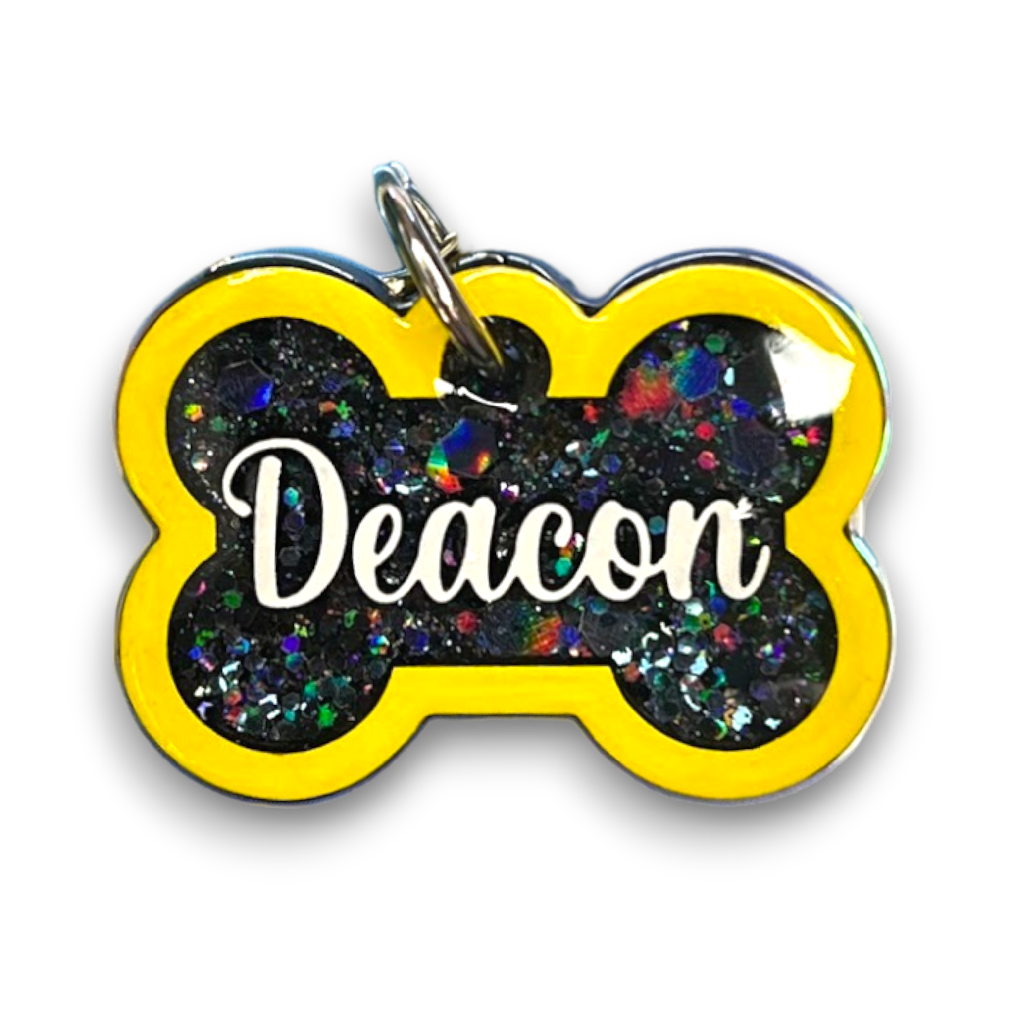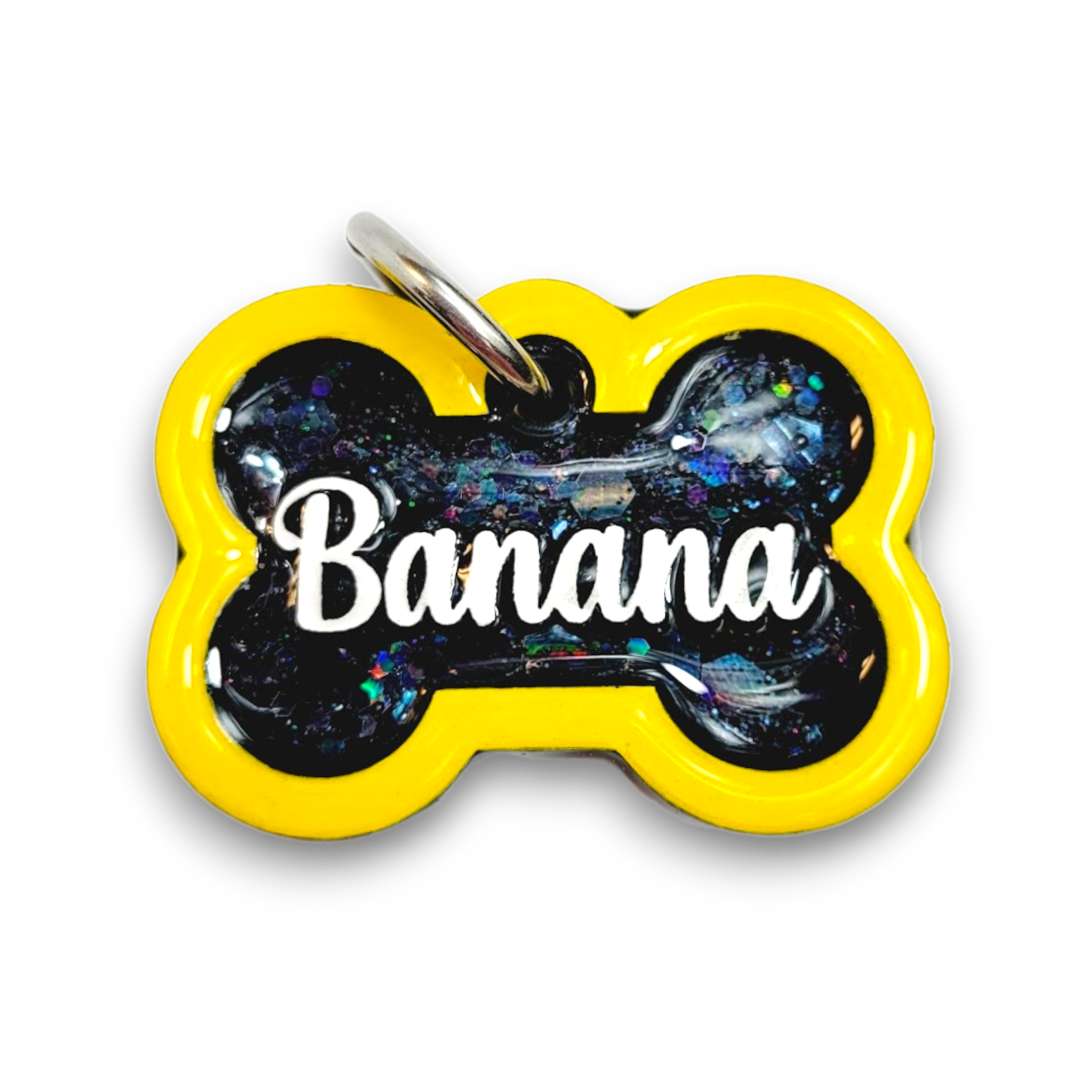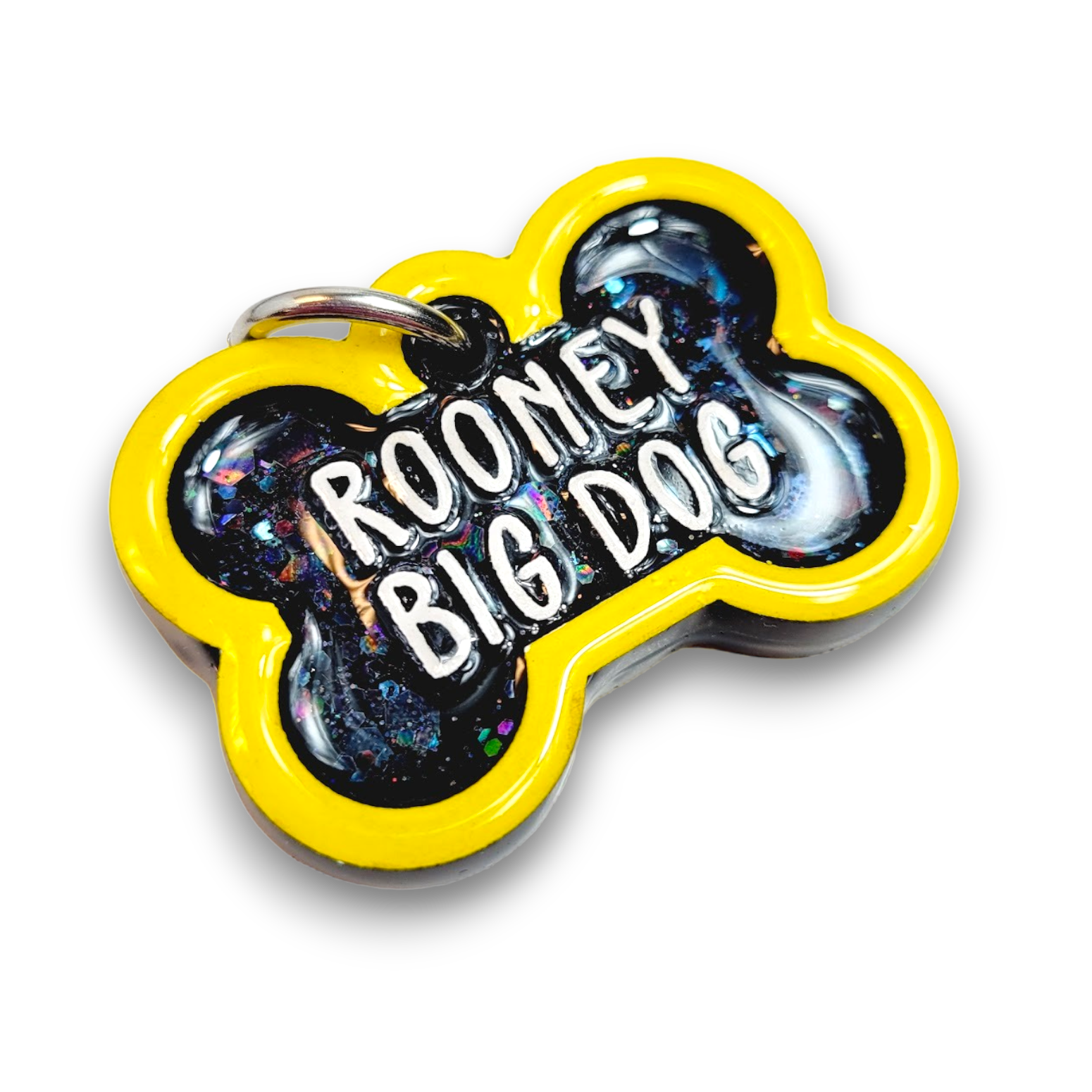 Our Poppin Select Series gives fur parents control over their customized tag. Choose from 16 colors and 12 sparkly fillings! Poppin Select Tags are approximately 1/4" thick- Please look at our tag size photo for full specs. Your pet's name will have a 3D effect and will POP! Each tag is hand painted and encased in UV Resin for durability and shine. Check out how they're made on our TikTok  & Instagram